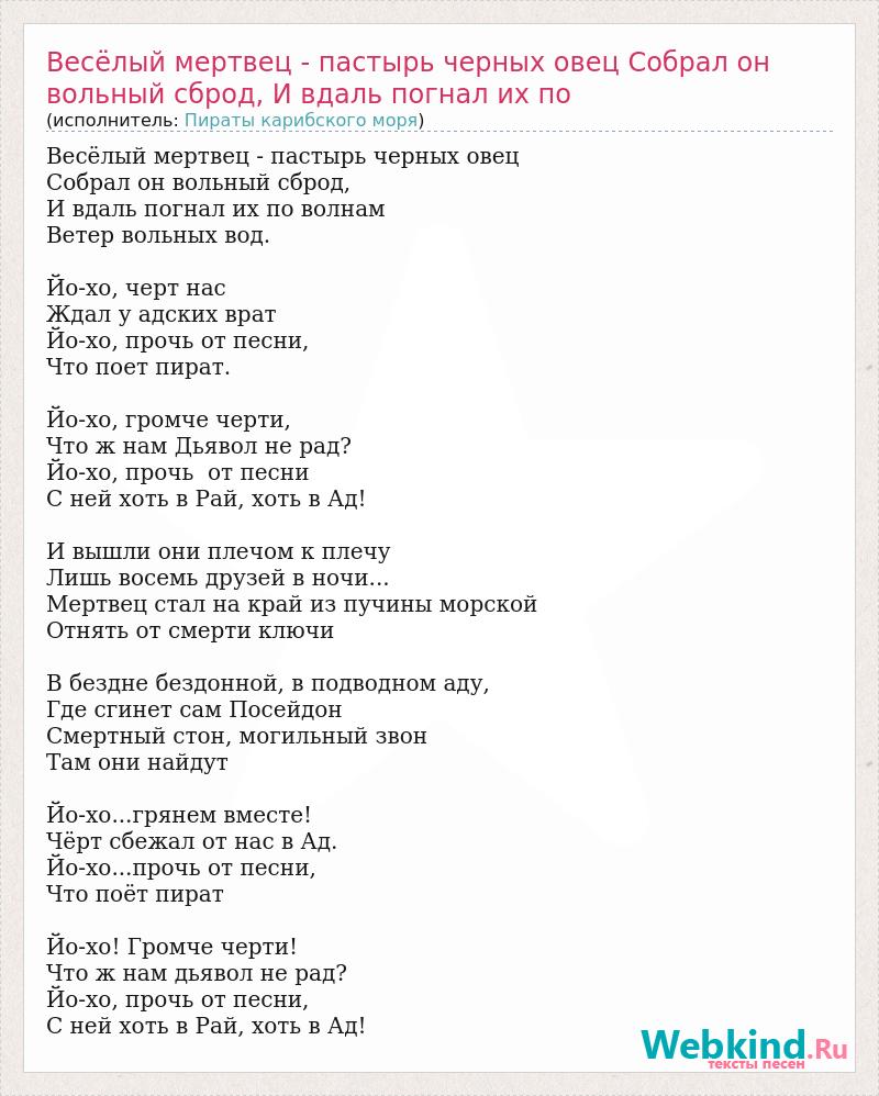 Весёлый мертвец - пастырь черных овец Собрал он вольный сброд, И вдаль погнал их по волнам Ветер вольных вод. Йо-хо, черт нас Ждал у адских врат Йо-хо, прочь от песни, Что поет пират. Йо-хо, громче черти, Что ж нам Дьявол не рад? Йо-хо, прочь от песни С ней хоть в Рай, хоть в Ад! И вышли они плечом к плечу Лишь восемь друзей в ночи... Мертвец стал на край из пучины морской Отнять от смерти ключи В бездне бездонной, в подводном аду, Где сгинет сам Посейдон Смертный стон, могильный звон Там они найдут Йо-хо...грянем вместе! Чёрт сбежал от нас в Ад. Йо-хо...прочь от песни, Что поёт пират Йо-хо! Громче черти! Что ж нам дьявол не рад? Йо-хо, прочь от песни, С ней хоть в Рай, хоть в Ад!