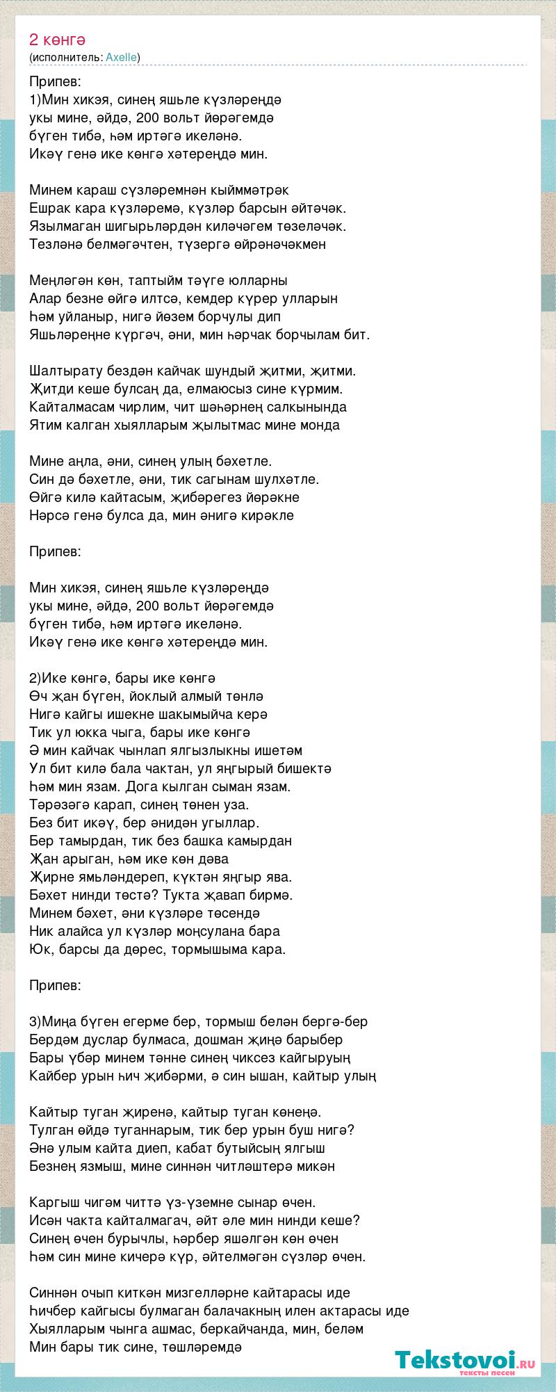 Припев: 1)Мин хикэя, синең яшьле күзләреңдә укы мине, әйдә, 200 вольт йөрәгемдә бүген тибә, һәм иртәгә икеләнә. Икәү генә ике көнгә хәтереңдә мин. Минем караш сүзләремнән кыйммәтрәк Ешрак кара күзләремә, күзләр барсын әйтәчәк. Язылмаган шигырьләрдән киләчәгем төзеләчәк. Тезләнә белмәгәчтен, түзергә өйрәнәчәкмен Меңләгән көн, таптыйм тәүге юлларны Алар безне өйгә илтсә, кемдер күрер улларын Һәм уйланыр, нигә йөзем борчулы дип Яшьләреңне күргәч, әни, мин һәрчак борчылам бит. Шалтырату бездән кайчак шундый җитми, җитми. Җитди кеше булсаң да, елмаюсыз сине күрмим. Кайталмасам чирлим, чит шәһәрнең салкынында Ятим калган хыялларым җылытмас мине монда Мине аңла, әни, синең улың бәхетле. Син дә бәхетле, әни, тик сагынам шулхәтле. Өйгә килә кайтасым, җибәрегез йөрәкне Нәрсә генә булса да, мин әнигә кирәкле Припев: Мин хикэя, синең яшьле күзләреңдә укы мине, әйдә, 200 вольт йөрәгемдә бүген тибә, һәм иртәгә икеләнә. Икәү генә ике көнгә хәтереңдә мин. 2)Ике көнгә, бары ике көнгә Өч җан бүген, йоклый алмый төнлә Нигә кайгы ишекне шакымыйча керә Тик ул юкка чыга, бары ике көнгә Ә мин кайчак чынлап ялгызлыкны ишетәм Ул бит килә бала чактан, ул яңгырый бишектә Һәм мин язам. Дога кылган сыман язам. Тәрәзәгә карап, синең төнен уза. Без бит икәү, бер әнидән угыллар. Бер тамырдан, тик без башка камырдан Җан арыган, һәм ике көн дәва Җирне ямьләндереп, күктән яңгыр ява. Бәхет нинди төстә? Тукта җавап бирмә. Минем бәхет, әни күзләре төсендә Ник алайса ул күзләр моңсулана бара Юк, барсы да дөрес, тормышыма кара. Припев: 3)Миңа бүген егерме бер, тормыш белән бергә-бер Бердәм дуслар булмаса, дошман җиңә барыбер Бары үбәр минем тәнне синең чиксез кайгыруың Кайбер урын һич җибәрми, ә син ышан, кайтыр улың Кайтыр туган җиренә, кайтыр туган көнеңә. Тулган өйдә туганнарым, тик бер урын буш нигә? Әнә улым кайта диеп, кабат бутыйсың ялгыш Безнең язмыш, мине синнән читләштерә микән Каргыш чигәм читтә үз-үземне сынар өчен. Исән чакта кайталмагач, әйт әле мин нинди кеше? Синең өчен бурычлы, һәрбер яшәлгән көн өчен Һәм син мине кичерә күр, әйтелмәгән сүзләр өчен. Синнән очып киткән мизгелләрне кайтарасы иде Һичбер кайгысы булмаган балачакның илен актарасы иде Хыялларым чынга ашмас, беркайчанда, мин, беләм Мин бары тик сине, төшләремдә