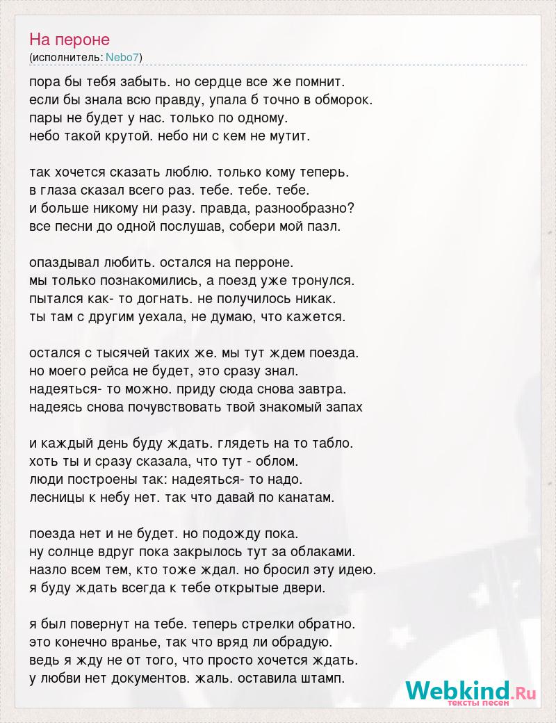 пора бы тебя забыть. но сердце все же помнит. если бы знала всю правду, упала б точно в обморок. пары не будет у нас. только по одному. небо такой крутой. небо ни с кем не мутит. так хочется сказать люблю. только кому теперь. в глаза сказал всего раз. тебе. тебе. тебе. и больше никому ни разу. правда, разнообразно? все песни до одной послушав, собери мой пазл. опаздывал любить. остался на перроне. мы только познакомились, а поезд уже тронулся. пытался как- то догнать. не получилось никак. ты там с другим уехала, не думаю, что кажется. остался с тысячей таких же. мы тут ждем поезда. но моего рейса не будет, это сразу знал. надеяться- то можно. приду сюда снова завтра. надеясь снова почувствовать твой знакомый запах и каждый день буду ждать. глядеть на то табло. хоть ты и сразу сказала, что тут - облом. люди построены так: надеяться- то надо. лесницы к небу нет. так что давай по канатам. поезда нет и не будет. но подожду пока. ну солнце вдруг пока закрылось тут за облаками. назло всем тем, кто тоже ждал. но бросил эту идею. я буду ждать всегда к тебе открытые двери. я был повернут на тебе. теперь стрелки обратно. это конечно вранье, так что вряд ли обрадую. ведь я жду не от того, что просто хочется ждать. у любви нет документов. жаль. оставила штамп.