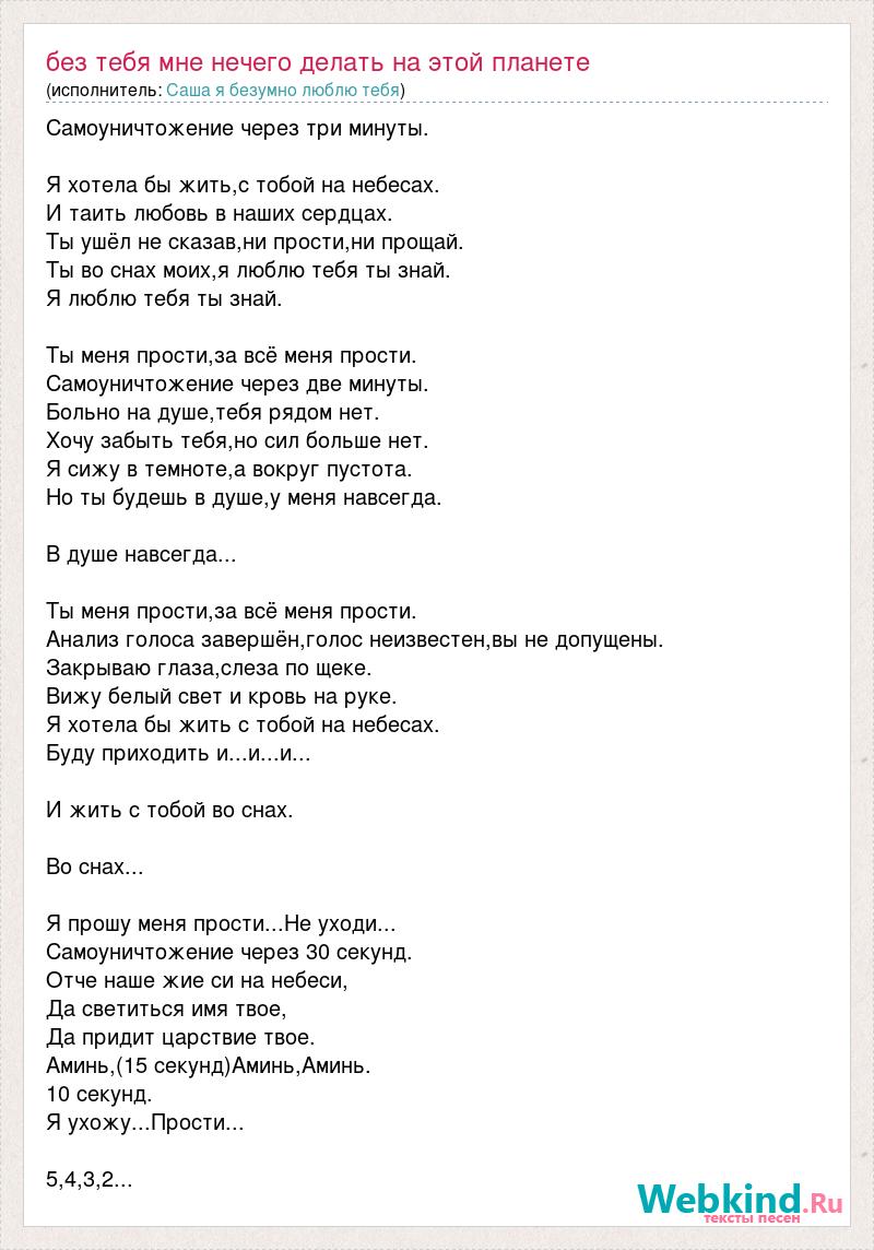 Самоуничтожение через три минуты. Я хотела бы жить,с тобой на небесах. И таить любовь в наших сердцах. Ты ушёл не сказав,ни прости,ни прощай. Ты во снах моих,я люблю тебя ты знай. Я люблю тебя ты знай. Ты меня прости,за всё меня прости. Самоуничтожение через две минуты. Больно на душе,тебя рядом нет. Хочу забыть тебя,но сил больше нет. Я сижу в темноте,а вокруг пустота. Но ты будешь в душе,у меня навсегда. В душе навсегда... Ты меня прости,за всё меня прости. Анализ голоса завершён,голос неизвестен,вы не допущены. Закрываю глаза,слеза по щеке. Вижу белый свет и кровь на руке. Я хотела бы жить с тобой на небесах. Буду приходить и...и...и... И жить с тобой во снах. Во снах... Я прошу меня прости...Не уходи... Самоуничтожение через 30 секунд. Отче наше жие си на небеси, Да светиться имя твое, Да придит царствие твое. Аминь,(15 секунд)Аминь,Аминь. 10 секунд. Я ухожу...Прости... 5,4,3,2...