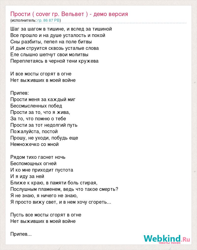 Шаг за шагом в тишине, и вслед за тишиной Все прошло и на душе усталость и покой Сны разбиты, пепел на поле битвы И дым струится сквозь усталые слова Еле слышно шепчут свои молитвы Переплетаясь в черной тени кружева И все мосты сгорят в огне Нет выживших в моей войне Припев: Прости меня за каждый миг Бессмысленных побед Прости за то, что я жива, За то, что помню о тебе Прости за тот недолгий путь Пожалуйста, постой Прошу, не уходи, побудь еще Немножечко со мной Рядом тихо гаснет ночь Беспомощных огней И ко мне приходит пустота И я иду за ней Ближе к краю, в памяти боль стирая, Послушным пламенем, ведь что такое смерть? Я не знаю, я ничего не знаю, Я просто вижу свет, и в нем хочу сгореть... Пусть все мосты сгорят в огне Нет выживших в моей войне Припев...