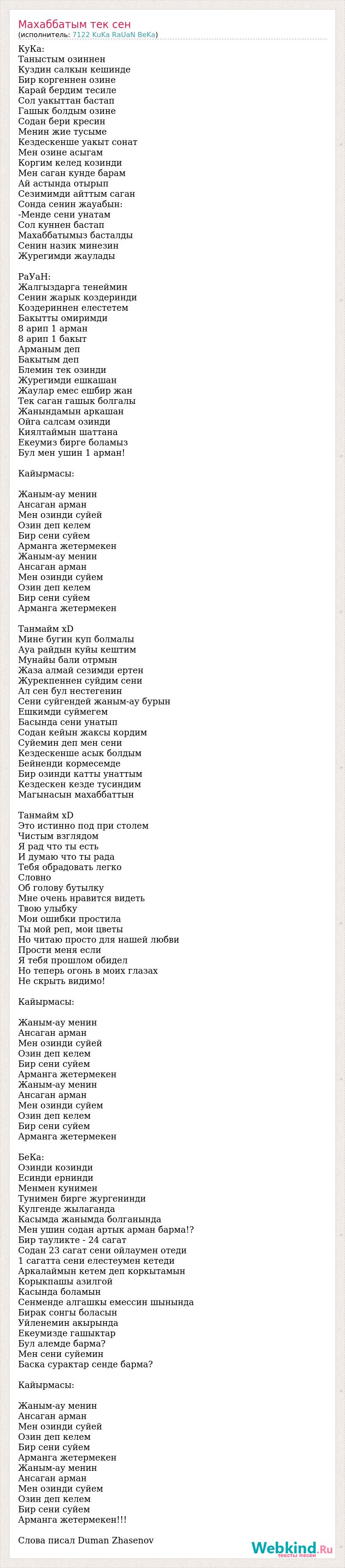 КуКа: Таныстым озиннен Куздин салкын кешинде Бир коргеннен озине Карай бердим тесиле Сол уакыттан бастап Гашык болдым озине Содан бери кресин Менин жие тусыме Кездескенше уакыт сонат Мен озине асыгам Коргим келед козинди Мен саган кунде барам Ай астында отырып Сезимимди айттым саган Сонда сенин жауабын: -Менде сени унатам Сол куннен бастап Махаббатымыз басталды Сенин назик минезин Журегимди жаулады РаУаН: Жалгыздарга тенеймин Сенин жарык коздеринди Коздериннен елестетем Бакытты омиримди 8 арип 1 арман 8 арип 1 бакыт Арманым деп Бакытым деп Блемин тек озинди Журегимди ешкашан Жаулар емес ешбир жан Тек саган гашык болгалы Жанындамын аркашан Ойга салсам озинди Киялтаймын шаттана Екеумиз бирге боламыз Бул мен ушин 1 арман! Кайырмасы: Жаным-ау менин Ансаган арман Мен озинди суйей Озин деп келем Бир сени суйем Арманга жетермекен Жаным-ау менин Ансаган арман Мен озинди суйем Озин деп келем Бир сени суйем Арманга жетермекен Танмайм xD Мине бугин куп болмалы Ауа райдын куйы кештим Мунайы бали отрмын Жаза алмай сезимди ертен Журекпеннен суйдим сени Ал сен бул нестегенин Сени суйгендей жаным-ау бурын Ешкимди суймегем Басында сени унатып Содан кейын жаксы кордим Суйемин деп мен сени Кездескенше асык болдым Бейненди кормесемде Бир озинди катты унаттым Кездескен кезде тусиндим Магынасын махаббаттын Танмайм xD Это истинно под при столем Чистым взглядом Я рад что ты есть И думаю что ты рада Тебя обрадовать легко Словно Об голову бутылку Мне очень нравится видеть Твою улыбку Мои ошибки простила Ты мой реп, мои цветы Но читаю просто для нашей любви Прости меня если Я тебя прошлом обидел Но теперь огонь в моих глазах Не скрыть видимо! Кайырмасы: Жаным-ау менин Ансаган арман Мен озинди суйей Озин деп келем Бир сени суйем Арманга жетермекен Жаным-ау менин Ансаган арман Мен озинди суйем Озин деп келем Бир сени суйем Арманга жетермекен БеКа: Озинди козинди Есинди ернинди Менмен кунимен Тунимен бирге жургенинди Кулгенде жылаганда Касымда жанымда болганында Мен ушин содан артык арман барма!? Бир тауликте - 24 сагат Содан 23 сагат сени ойлаумен отеди 1 сагатта сени елестеумен кетеди Аркалаймын кетем деп коркытамын Корыкпашы азилгой Касында боламын Сенменде алгашкы емессин шынында Бирак сонгы боласын Уйленемин акырында Екеумизде гашыктар Бул алемде барма? Мен сени суйемин Баска сурактар сенде барма? Кайырмасы: Жаным-ау менин Ансаган арман Мен озинди суйей Озин деп келем Бир сени суйем Арманга жетермекен Жаным-ау менин Ансаган арман Мен озинди суйем Озин деп келем Бир сени суйем Арманга жетермекен!!! Слова писал Duman Zhasenov