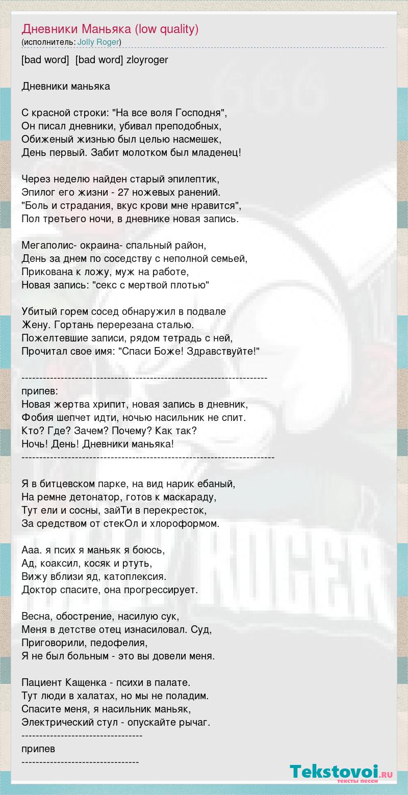 [bad word] [bad word] zloyroger Дневники маньяка С красной строки: "На все воля Господня", Он писал дневники, убивал преподобных, Обиженый жизнью был целью насмешек, День первый. Забит молотком был младенец! Через неделю найден старый эпилептик, Эпилог его жизни - 27 ножевых ранений. "Боль и страдания, вкус крови мне нравится", Пол третьего ночи, в дневнике новая запись. Мегаполис- окраина- спальный район, День за днем по соседству с неполной семьей, Прикована к ложу, муж на работе, Новая запись: "секс с мертвой плотью" Убитый горем сосед обнаружил в подвале Жену. Гортань перерезана сталью. Пожелтевшие записи, рядом тетрадь с ней, Прочитал свое имя: "Спаси Боже! Здравствуйте!" --------------------------------------------------------------------- припев: Новая жертва хрипит, новая запись в дневник, Фобия шепчет идти, ночью насильник не спит. Кто? Где? Зачем? Почему? Как так? Ночь! День! Дневники маньяка! ----------------------------------------------------------------------- Я в битцевском парке, на вид нарик ебаный, На ремне детонатор, готов к маскараду, Тут ели и сосны, зайТи в перекресток, За средством от стекОл и хлороформом. Ааа. я псих я маньяк я боюсь, Ад, коаксил, косяк и ртуть, Вижу вблизи яд, катоплексия. Доктор спасите, она прогрессирует. Весна, обострение, насилую сук, Меня в детстве отец изнасиловал. Суд, Приговорили, педофелия, Я не был больным - это вы довели меня. Пациент Кащенка - психи в палате. Тут люди в халатах, но мы не поладим. Спасите меня, я насильник маньяк, Электрический стул - опускайте рычаг. ---------------------------------- припев ---------------------------------