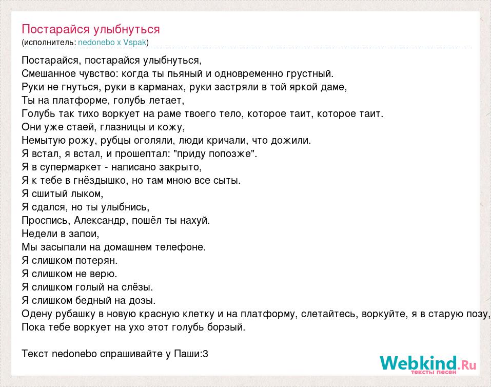 Постарайся, постарайся улыбнуться, Смешанное чувство: когда ты пьяный и одновременно грустный. Руки не гнуться, руки в карманах, руки застряли в той яркой даме, Ты на платформе, голубь летает, Голубь так тихо воркует на раме твоего тело, которое таит, которое таит. Они уже стаей, глазницы и кожу, Немытую рожу, рубцы оголяли, люди кричали, что дожили. Я встал, я встал, и прошептал: "приду попозже". Я в супермаркет - написано закрыто, Я к тебе в гнёздышко, но там мною все сыты. Я сшитый лыком, Я сдался, но ты улыбнись, Проспись, Александр, пошёл ты нахуй. Недели в запои, Мы засыпали на домашнем телефоне. Я слишком потерян. Я слишком не верю. Я слишком голый на слёзы. Я слишком бедный на дозы. Одену рубашку в новую красную клетку и на платформу, слетайтесь, воркуйте, я в старую позу, Пока тебе воркует на ухо этот голубь борзый. Текст nedonebo спрашивайте у Паши:3