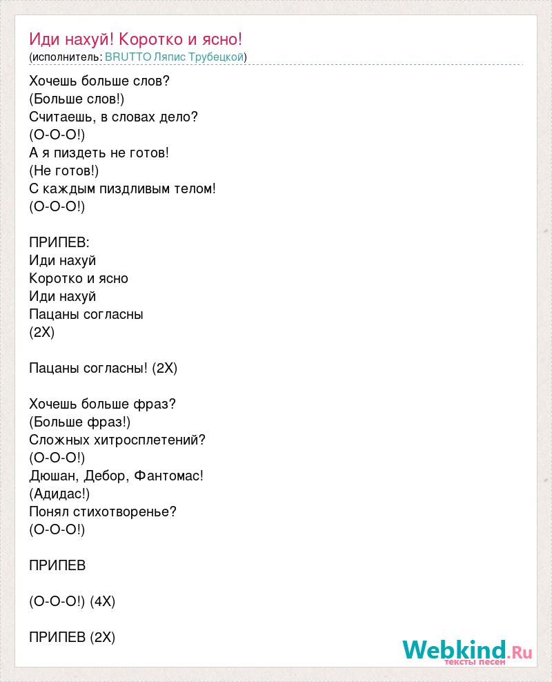Хочешь больше слов? (Больше слов!) Считаешь, в словах дело? (О-О-О!) А я пиздеть не готов! (Не готов!) С каждым пиздливым телом! (О-О-О!) ПРИПЕВ: Иди нахуй Коротко и ясно Иди нахуй Пацаны согласны (2X) Пацаны согласны! (2X) Хочешь больше фраз? (Больше фраз!) Сложных хитросплетений? (О-О-О!) Дюшан, Дебор, Фантомас! (Адидас!) Понял стихотворенье? (О-О-О!) ПРИПЕВ (О-О-О!) (4X) ПРИПЕВ (2X)