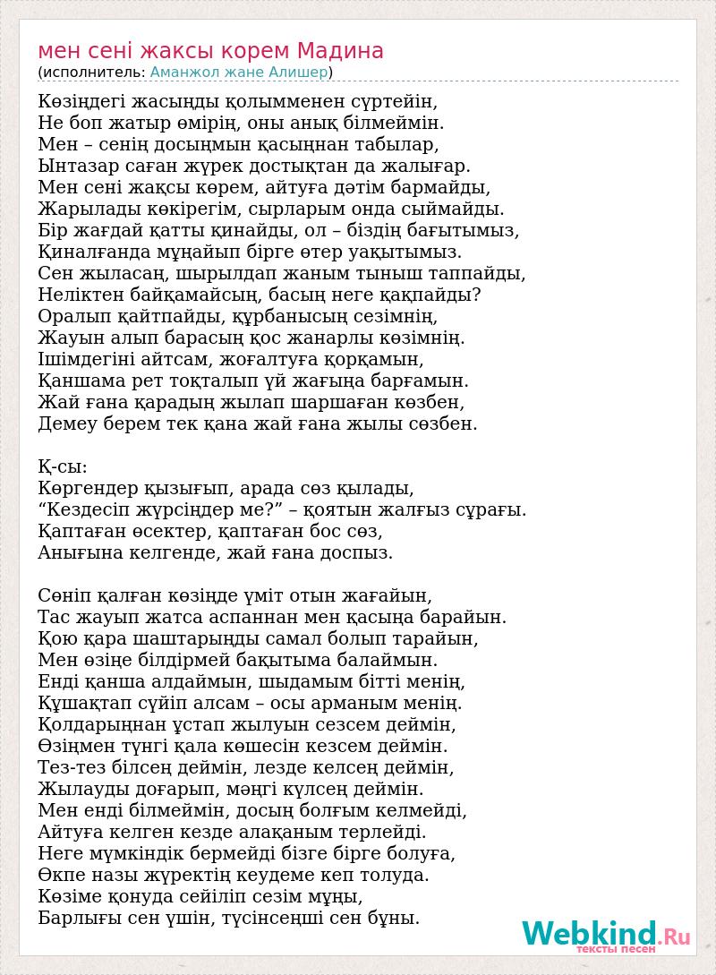 Көзіңдегі жасыңды қолымменен сүртейін, Не боп жатыр өмірің, оны анық білмеймін. Мен – сенің досыңмын қасыңнан табылар, Ынтазар саған жүрек достықтан да жалығар. Мен сені жақсы көрем, айтуға дәтім бармайды, Жарылады көкірегім, сырларым онда сыймайды. Бір жағдай қатты қинайды, ол – біздің бағытымыз, Қиналғанда мұңайып бірге өтер уақытымыз. Сен жыласаң, шырылдап жаным тыныш таппайды, Неліктен байқамайсың, басың неге қақпайды? Оралып қайтпайды, құрбанысың сезімнің, Жауын алып барасың қос жанарлы көзімнің. Ішімдегіні айтсам, жоғалтуға қорқамын, Қаншама рет тоқталып үй жағыңа барғамын. Жай ғана қарадың жылап шаршаған көзбен, Демеу берем тек қана жай ғана жылы сөзбен. Қ-сы: Көргендер қызығып, арада сөз қылады, “Кездесіп жүрсіңдер ме?” – қоятын жалғыз сұрағы. Қаптаған өсектер, қаптаған бос сөз, Анығына келгенде, жай ғана доспыз. Сөніп қалған көзіңде үміт отын жағайын, Тас жауып жатса аспаннан мен қасыңа барайын. Қою қара шаштарыңды самал болып тарайын, Мен өзіңе білдірмей бақытыма балаймын. Енді қанша алдаймын, шыдамым бітті менің, Құшақтап сүйіп алсам – осы арманым менің. Қолдарыңнан ұстап жылуын сезсем деймін, Өзіңмен түнгі қала көшесін кезсем деймін. Тез-тез білсең деймін, лезде келсең деймін, Жылауды доғарып, мәңгі күлсең деймін. Мен енді білмеймін, досың болғым келмейді, Айтуға келген кезде алақаным терлейді. Неге мүмкіндік бермейді бізге бірге болуға, Өкпе назы жүректің кеудеме кеп толуда. Көзіме қонуда сейіліп сезім мұңы, Барлығы сен үшін, түсінсеңші сен бұны.