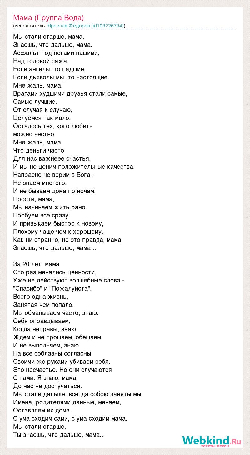 Мы стали старше, мама, Знаешь, что дальше, мама. Асфальт под ногами нашими, Над головой сажа. Если ангелы, то падшие, Если дьяволы мы, то настоящие. Мне жаль, мама. Врагами худшими друзья стали самые, Самые лучшие. От случая к случаю, Целуемся так мало. Осталось тех, кого любить можно честно Мне жаль, мама, Что деньги часто Для нас важнеее счастья. И мы не ценим положительные качества. Напрасно не верим в Бога - Не знаем многого. И не бываем дома по ночам. Прости, мама, Мы начинаем жить рано. Пробуем все сразу И привыкаем быстро к новому, Плохому чаще чем к хорошему. Как ни странно, но это правда, мама, Знаешь, что дальше, мама ... За 20 лет, мама Сто раз менялись ценности, Уже не действуют волшебные слова - "Спасибо" и "Пожалуйста". Всего одна жизнь, Занятая чем попало. Мы обманываем часто, знаю. Себя оправдываем, Когда неправы, знаю. Ждем и не прощаем, обещаем И не выполняем, знаю. На все соблазны согласны. Своими же руками убиваем себя. Это несчастье. Но они случаются С нами. Я знаю, мама, До нас не достучаться. Мы стали дальше, всегда собою заняты мы. Имена, родителями данные, меняем, Оставляем их дома. С ума сходим сами, с ума сходим мама. Мы стали старше, Ты знаешь, что дальше, мама..