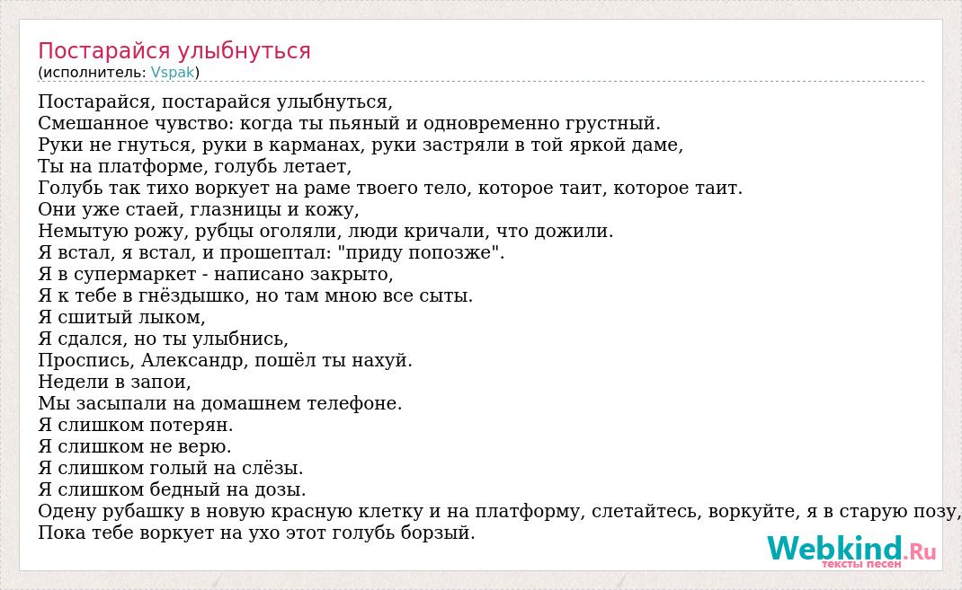 Постарайся, постарайся улыбнуться, Смешанное чувство: когда ты пьяный и одновременно грустный. Руки не гнуться, руки в карманах, руки застряли в той яркой даме, Ты на платформе, голубь летает, Голубь так тихо воркует на раме твоего тело, которое таит, которое таит. Они уже стаей, глазницы и кожу, Немытую рожу, рубцы оголяли, люди кричали, что дожили. Я встал, я встал, и прошептал: "приду попозже". Я в супермаркет - написано закрыто, Я к тебе в гнёздышко, но там мною все сыты. Я сшитый лыком, Я сдался, но ты улыбнись, Проспись, Александр, пошёл ты нахуй. Недели в запои, Мы засыпали на домашнем телефоне. Я слишком потерян. Я слишком не верю. Я слишком голый на слёзы. Я слишком бедный на дозы. Одену рубашку в новую красную клетку и на платформу, слетайтесь, воркуйте, я в старую позу, Пока тебе воркует на ухо этот голубь борзый.