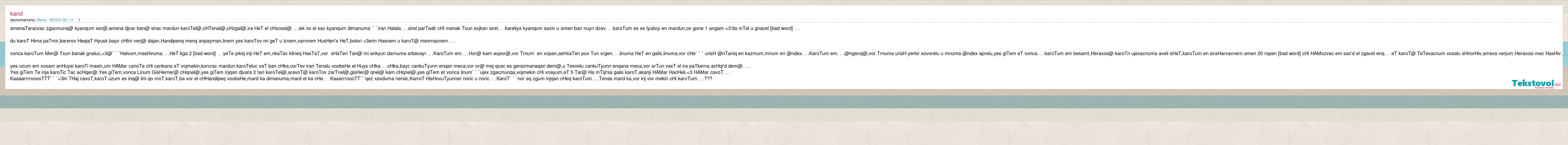 amenaTaracvac zgacmunq@ kyanqum ser@,amena djvar ban@ sirac mardun karoTel@,cHTenal@,cHzgal@,ira HeT el cHxosal@. . .isk ov el sax kyanqum dimanuma` ` `iran Halala. . .sirel parTadir cHi menak Txun axjkan sirel. . .kareliya kyanqum saxin u amen ban nuyn dzev. . .karoTum es es lyuboy en mardun,ov gone 1 angam <3'da mTel u gnacel Heru. . . du karoT Hima paTmir,barerov HeqiaT Hyusir,bayc cHlini verj@ dajan,Handipenq menq anpayman,linem yes karoTov mi geT u lcvem,xarnvem HusHeri's HeT,bolori <3erin Hasnem u karoT@ mexmacnem. . . vonca karoTum Mer@ Txun banak gnaluc,<3@` ` `Halvum,masHvuma. . .HeT kga 2 taruc. . .yeTe jokiq inji HeT em,nkaTac klineq HasTaT,vor sHaTeri Tan@ mi ankyun darnuma srbavayr. . .KaroTum em. . .Hor@ kam axpor@,vor Trnum en xopan,asHxaTen pox Tun xrgen. . .linuma HeT en galis,linuma,vor cHe` ` ` urisH @nTaniq en kazmum,mnum en @ndex. . .KaroTum em. . .@ngeroj@,vor Trnuma urisH yerkir sovorelu u mnuma @ndex aprelu,yes giTem eT vonca. . .karoTum em besamt,Heraxos@ karoTn ujexacnuma aveli sHaT,karoTum en siraHarvacnern amen 20 ropen mek,noruTyun cHi HAMozvac em sax'd el zgacel enq. . .eT karoT@ TeTevacnum xosalu sHnorHiv,amsva verjum Heraxosi mec HasHiv. . . yes uzum em xosam anHuysi karoTi masin,um HAMar canoTa cHi cankana eT vojmekin,korcrac mardun karoTeluc vaT ban cHka,vorTev iran Tenalu voobsHe el Huys cHka. . .cHka,bayc cankuTyunn enqan meca,vor or@ mej qcac es gerezmanaqari dem@,u Tesnelu cankuTyunn enqana meca,vor arTun vaxT el ira paTkerna acHqi'd dem@. . . Yes giTem Te inja karoTic Tac acHqer@,Yes giTem,vonca Linum GisHerner@ cHqnel@,yes giTem injqan djvara 2 tari karoTel@,aravoT@ karoTov zarTnel@,gisHer@ qnel@ kam cHqnel@,yes giTem et vonca linum` ` `ujex zgacmunqa,vojmekin cHi xnayum,eT 5 Tar@ Ha mTqi'sa galis karoT,akanji HAMar HacHeli,<3 HAMar cavoT. . . KaaaarrrrooooTTT` ` `<3in THaj cavoT,karoT uzum es inq@ lini qo moT,karoT,ba vor el cHHandipeq voobsHe,mard ka dimanuma,mard el ka cHe. . .KaaarrroooTT```qez xexduma nersic,KarroT HisHoxuTyunner noric u noric. . .KaroT` ` `nor eq zgum injqan cHeq karoTum. . .Tenas mard ka,vor inj vor mekin cHi karoTum. . .???