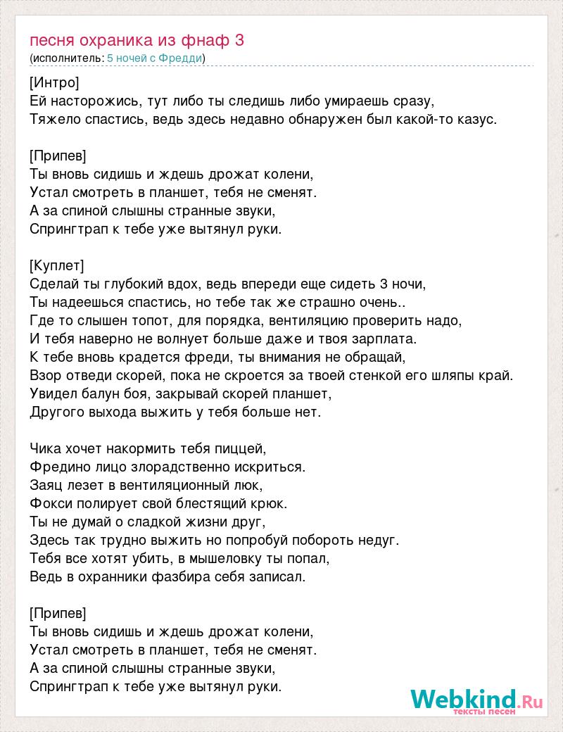 [Интро] Ей насторожись, тут либо ты следишь либо умираешь сразу, Тяжело спастись, ведь здесь недавно обнаружен был какой-то казус. [Припев] Ты вновь сидишь и ждешь дрожат колени, Устал смотреть в планшет, тебя не сменят. А за спиной слышны странные звуки, Спрингтрап к тебе уже вытянул руки. [Куплет] Сделай ты глубокий вдох, ведь впереди еще сидеть 3 ночи, Ты надеешься спастись, но тебе так же страшно очень.. Где то слышен топот, для порядка, вентиляцию проверить надо, И тебя наверно не волнует больше даже и твоя зарплата. К тебе вновь крадется фреди, ты внимания не обращай, Взор отведи скорей, пока не скроется за твоей стенкой его шляпы край. Увидел балун боя, закрывай скорей планшет, Другого выхода выжить у тебя больше нет. Чика хочет накормить тебя пиццей, Фредино лицо злорадственно искриться. Заяц лезет в вентиляционный люк, Фокси полирует свой блестящий крюк. Ты не думай о сладкой жизни друг, Здесь так трудно выжить но попробуй побороть недуг. Тебя все хотят убить, в мышеловку ты попал, Ведь в охранники фазбира себя записал. [Припев] Ты вновь сидишь и ждешь дрожат колени, Устал смотреть в планшет, тебя не сменят. А за спиной слышны странные звуки, Спрингтрап к тебе уже вытянул руки.