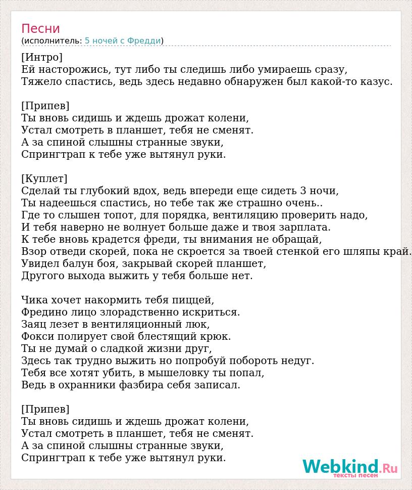 [Интро] Ей насторожись, тут либо ты следишь либо умираешь сразу, Тяжело спастись, ведь здесь недавно обнаружен был какой-то казус. [Припев] Ты вновь сидишь и ждешь дрожат колени, Устал смотреть в планшет, тебя не сменят. А за спиной слышны странные звуки, Спрингтрап к тебе уже вытянул руки. [Куплет] Сделай ты глубокий вдох, ведь впереди еще сидеть 3 ночи, Ты надеешься спастись, но тебе так же страшно очень.. Где то слышен топот, для порядка, вентиляцию проверить надо, И тебя наверно не волнует больше даже и твоя зарплата. К тебе вновь крадется фреди, ты внимания не обращай, Взор отведи скорей, пока не скроется за твоей стенкой его шляпы край. Увидел балун боя, закрывай скорей планшет, Другого выхода выжить у тебя больше нет. Чика хочет накормить тебя пиццей, Фредино лицо злорадственно искриться. Заяц лезет в вентиляционный люк, Фокси полирует свой блестящий крюк. Ты не думай о сладкой жизни друг, Здесь так трудно выжить но попробуй побороть недуг. Тебя все хотят убить, в мышеловку ты попал, Ведь в охранники фазбира себя записал. [Припев] Ты вновь сидишь и ждешь дрожат колени, Устал смотреть в планшет, тебя не сменят. А за спиной слышны странные звуки, Спрингтрап к тебе уже вытянул руки.