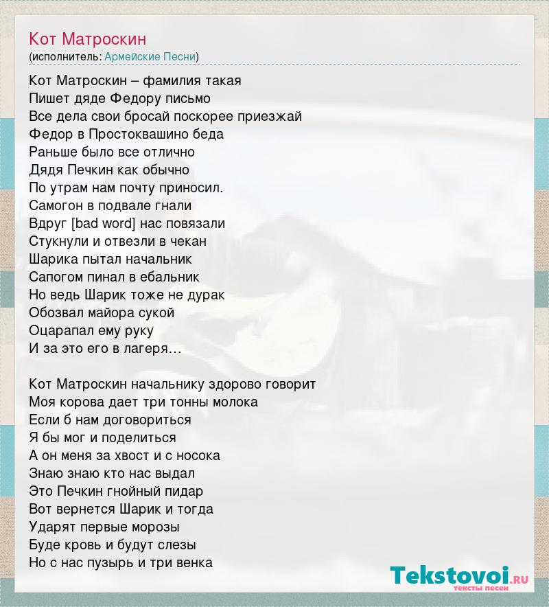 Кот Матроскин – фамилия такая Пишет дяде Федору письмо Все дела свои бросай поскорее приезжай Федор в Простоквашино беда Раньше было все отлично Дядя Печкин как обычно По утрам нам почту приносил. Самогон в подвале гнали Вдруг [bad word] нас повязали Стукнули и отвезли в чекан Шарика пытал начальник Сапогом пинал в ебальник Но ведь Шарик тоже не дурак Обозвал майора сукой Оцарапал ему руку И за это его в лагеря… Кот Матроскин начальнику здорово говорит Моя корова дает три тонны молока Если б нам договориться Я бы мог и поделиться А он меня за хвост и с носока Знаю знаю кто нас выдал Это Печкин гнойный пидар Вот вернется Шарик и тогда Ударят первые морозы Буде кровь и будут слезы Но с нас пузырь и три венка