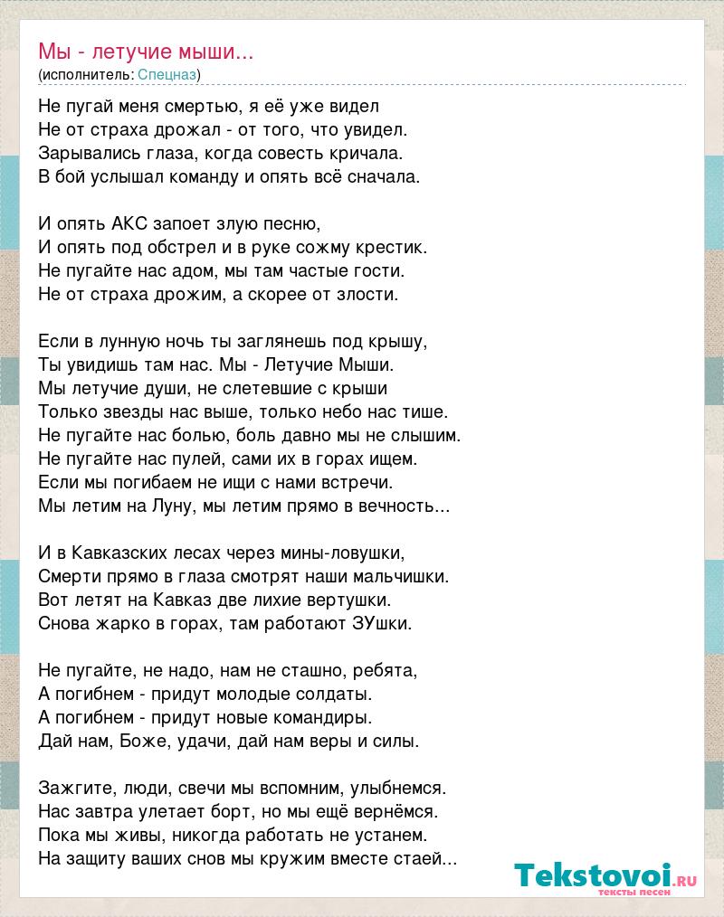Не пугай меня смертью, я её уже видел Не от страха дрожал - от того, что увидел. Зарывались глаза, когда совесть кричала. В бой услышал команду и опять всё сначала. И опять АКС запоет злую песню, И опять под обстрел и в руке сожму крестик. Не пугайте нас адом, мы там частые гости. Не от страха дрожим, а скорее от злости. Если в лунную ночь ты заглянешь под крышу, Ты увидишь там нас. Мы - Летучие Мыши. Мы летучие души, не слетевшие с крыши Только звезды нас выше, только небо нас тише. Не пугайте нас болью, боль давно мы не слышим. Не пугайте нас пулей, сами их в горах ищем. Если мы погибаем не ищи с нами встречи. Мы летим на Луну, мы летим прямо в вечность... И в Кавказских лесах через мины-ловушки, Смерти прямо в глаза смотрят наши мальчишки. Вот летят на Кавказ две лихие вертушки. Снова жарко в горах, там работают ЗУшки. Не пугайте, не надо, нам не сташно, ребята, А погибнем - придут молодые солдаты. А погибнем - придут новые командиры. Дай нам, Боже, удачи, дай нам веры и силы. Зажгите, люди, свечи мы вспомним, улыбнемся. Нас завтра улетает борт, но мы ещё вернёмся. Пока мы живы, никогда работать не устанем. На защиту ваших снов мы кружим вместе стаей...