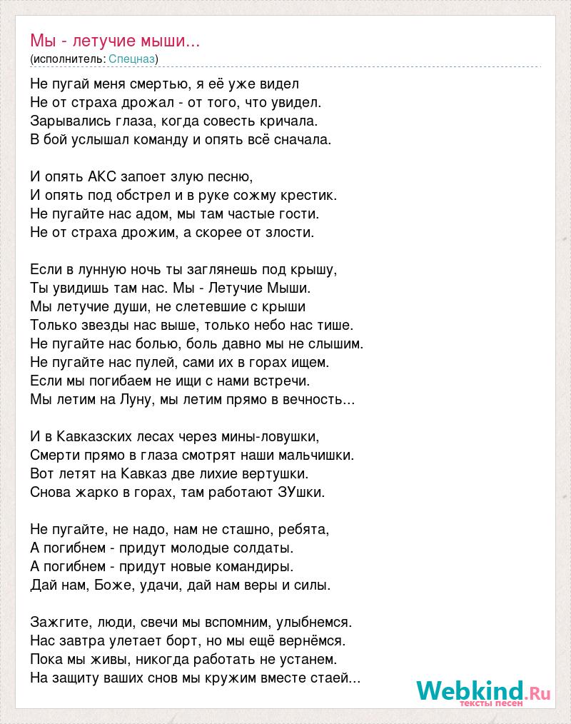 Не пугай меня смертью, я её уже видел Не от страха дрожал - от того, что увидел. Зарывались глаза, когда совесть кричала. В бой услышал команду и опять всё сначала. И опять АКС запоет злую песню, И опять под обстрел и в руке сожму крестик. Не пугайте нас адом, мы там частые гости. Не от страха дрожим, а скорее от злости. Если в лунную ночь ты заглянешь под крышу, Ты увидишь там нас. Мы - Летучие Мыши. Мы летучие души, не слетевшие с крыши Только звезды нас выше, только небо нас тише. Не пугайте нас болью, боль давно мы не слышим. Не пугайте нас пулей, сами их в горах ищем. Если мы погибаем не ищи с нами встречи. Мы летим на Луну, мы летим прямо в вечность... И в Кавказских лесах через мины-ловушки, Смерти прямо в глаза смотрят наши мальчишки. Вот летят на Кавказ две лихие вертушки. Снова жарко в горах, там работают ЗУшки. Не пугайте, не надо, нам не сташно, ребята, А погибнем - придут молодые солдаты. А погибнем - придут новые командиры. Дай нам, Боже, удачи, дай нам веры и силы. Зажгите, люди, свечи мы вспомним, улыбнемся. Нас завтра улетает борт, но мы ещё вернёмся. Пока мы живы, никогда работать не устанем. На защиту ваших снов мы кружим вместе стаей...
