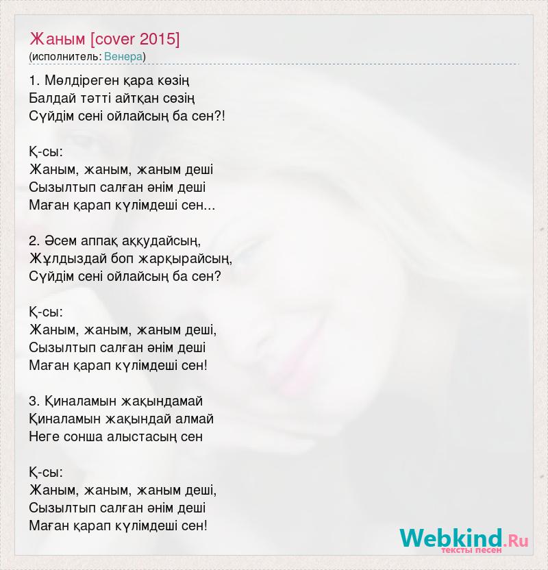 1. Мөлдіреген қара көзің Балдай тәтті айтқан сөзің Сүйдім сені ойлайсың ба сен?! Қ-сы: Жаным, жаным, жаным деші Сызылтып салған әнім деші Маған қарап күлімдеші сен... 2. Әсем аппақ аққудайсың, Жұлдыздай боп жарқырайсың, Сүйдiм сенi ойлайсың ба сен? Қ-сы: Жаным, жаным, жаным деші, Сызылтып салған әнім деші Маған қарап күлімдеші сен! 3. Қиналамын жақындамай Қиналамын жақындай алмай Неге сонша алыстасың сен Қ-сы: Жаным, жаным, жаным деші, Сызылтып салған әнім деші Маған қарап күлімдеші сен!