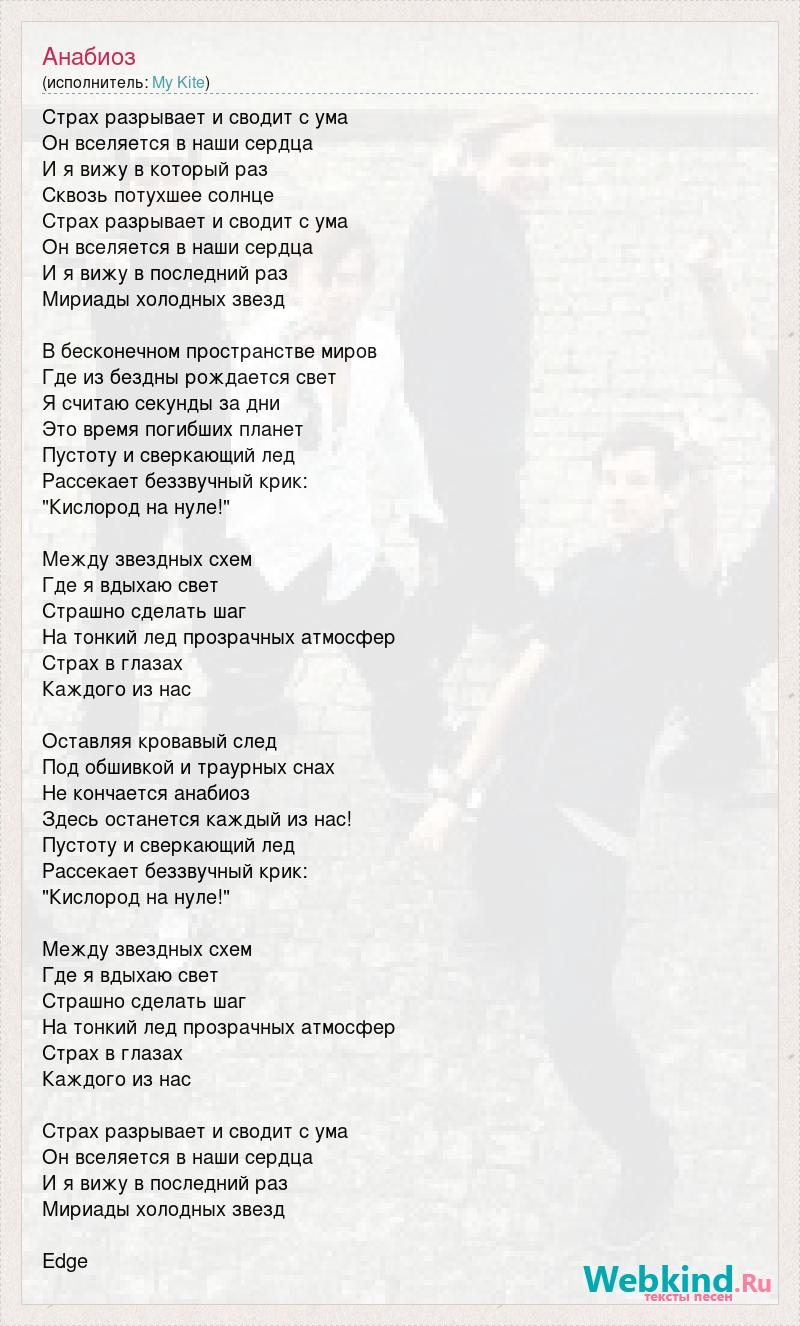 Страх разрывает и сводит с ума Он вселяется в наши сердца И я вижу в который раз Сквозь потухшее солнце Страх разрывает и сводит с ума Он вселяется в наши сердца И я вижу в последний раз Мириады холодных звезд В бесконечном пространстве миров Где из бездны рождается свет Я считаю секунды за дни Это время погибших планет Пустоту и сверкающий лед Рассекает беззвучный крик: "Кислород на нуле!" Между звездных схем Где я вдыхаю свет Страшно сделать шаг На тонкий лед прозрачных атмосфер Страх в глазах Каждого из нас Оставляя кровавый след Под обшивкой и траурных снах Не кончается анабиоз Здесь останется каждый из нас! Пустоту и сверкающий лед Рассекает беззвучный крик: "Кислород на нуле!" Между звездных схем Где я вдыхаю свет Страшно сделать шаг На тонкий лед прозрачных атмосфер Страх в глазах Каждого из нас Страх разрывает и сводит с ума Он вселяется в наши сердца И я вижу в последний раз Мириады холодных звезд Edge