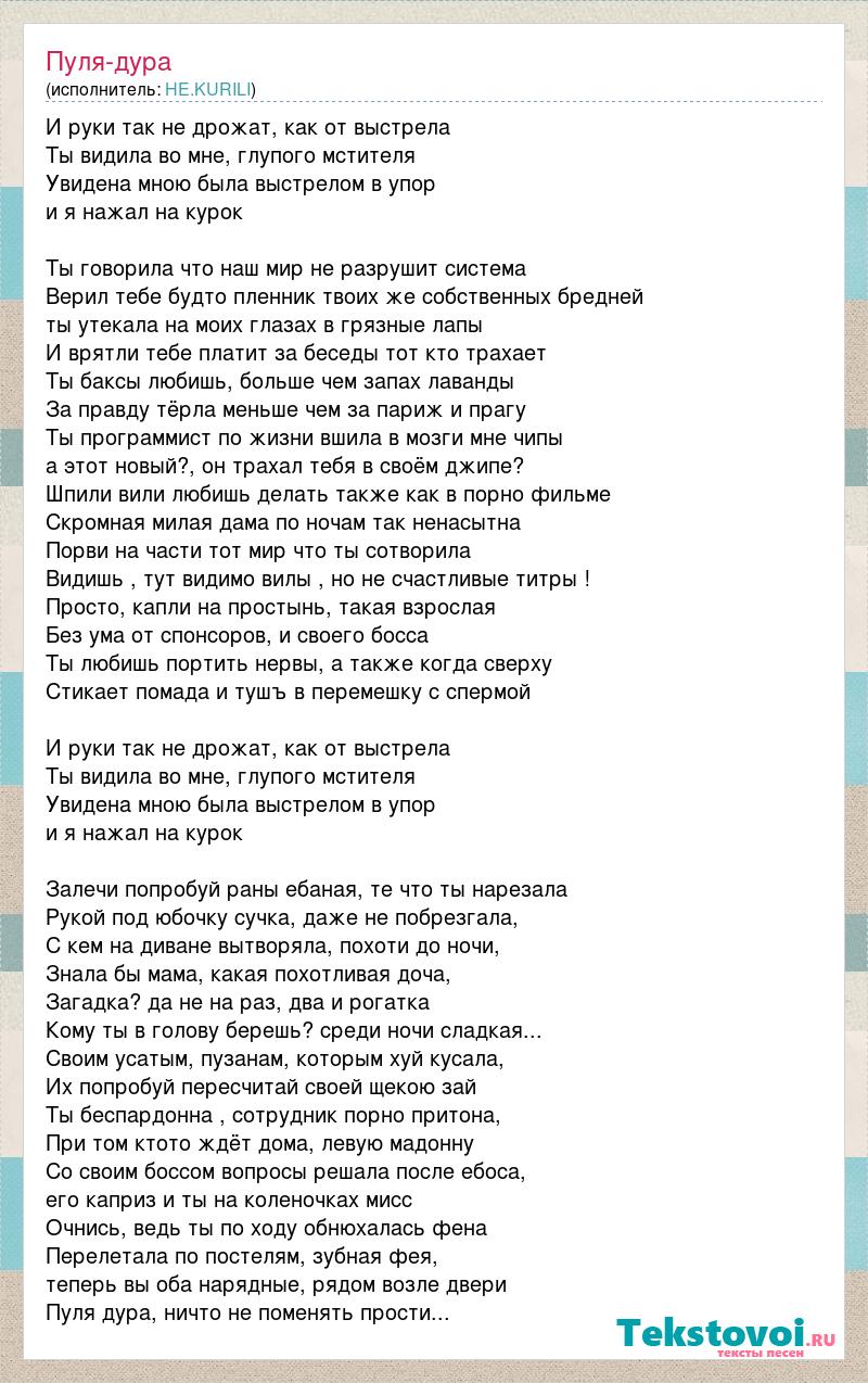И руки так не дрожат, как от выстрела Ты видила во мне, глупого мстителя Увидена мною была выстрелом в упор и я нажал на курок Ты говорила что наш мир не разрушит система Верил тебе будто пленник твоих же собственных бредней ты утекала на моих глазах в грязные лапы И врятли тебе платит за беседы тот кто трахает Ты баксы любишь, больше чем запах лаванды За правду тёрла меньше чем за париж и прагу Ты программист по жизни вшила в мозги мне чипы а этот новый?, он трахал тебя в своём джипе? Шпили вили любишь делать также как в порно фильме Скромная милая дама по ночам так ненасытна Порви на части тот мир что ты сотворила Видишь , тут видимо вилы , но не счастливые титры ! Просто, капли на простынь, такая взрослая Без ума от спонсоров, и своего босса Ты любишь портить нервы, а также когда сверху Стикает помада и тушъ в перемешку с спермой И руки так не дрожат, как от выстрела Ты видила во мне, глупого мстителя Увидена мною была выстрелом в упор и я нажал на курок Залечи попробуй раны ебаная, те что ты нарезала Рукой под юбочку сучка, даже не побрезгала, С кем на диване вытворяла, похоти до ночи, Знала бы мама, какая похотливая доча, Загадка? да не на раз, два и рогатка Кому ты в голову берешь? среди ночи сладкая... Своим усатым, пузанам, которым хуй кусала, Их попробуй пересчитай своей щекою зай Ты беспардонна , сотрудник порно притона, При том ктото ждёт дома, левую мадонну Со своим боссом вопросы решала после ебоса, его каприз и ты на коленочках мисс Очнись, ведь ты по ходу обнюхалась фена Перелетала по постелям, зубная фея, теперь вы оба нарядные, рядом возле двери Пуля дура, ничто не поменять прости...