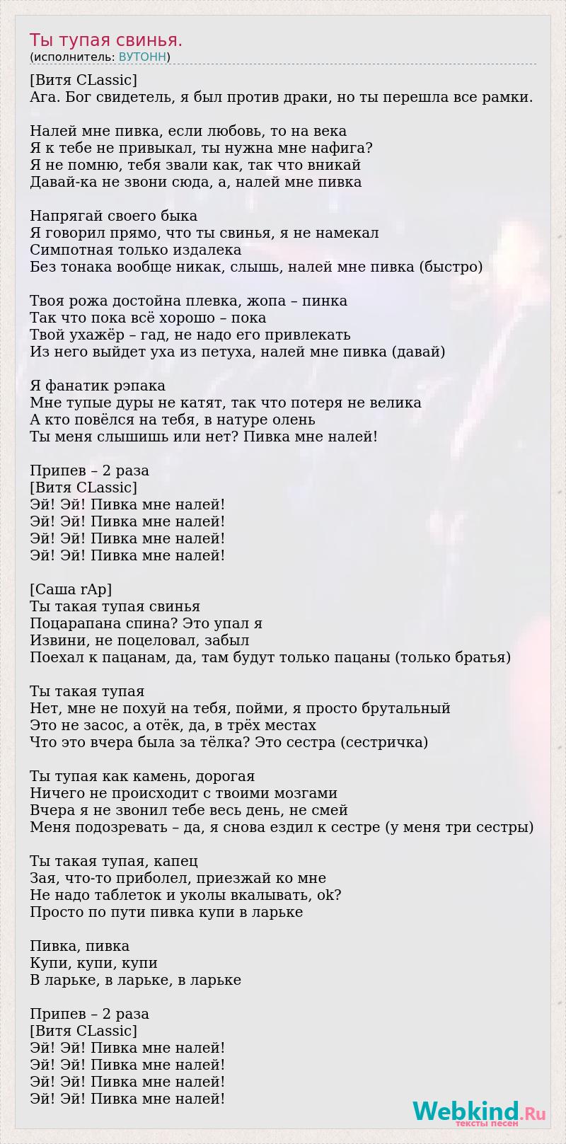 [Витя CLassic] Ага. Бог свидетель, я был против драки, но ты перешла все рамки. Налей мне пивка, если любовь, то на века Я к тебе не привыкал, ты нужна мне нафига? Я не помню, тебя звали как, так что вникай Давай-ка не звони сюда, а, налей мне пивка Напрягай своего быка Я говорил прямо, что ты свинья, я не намекал Симпотная только издалека Без тонака вообще никак, слышь, налей мне пивка (быстро) Твоя рожа достойна плевка, жопа – пинка Так что пока всё хорошо – пока Твой ухажёр – гад, не надо его привлекать Из него выйдет уха из петуха, налей мне пивка (давай) Я фанатик рэпака Мне тупые дуры не катят, так что потеря не велика А кто повёлся на тебя, в натуре олень Ты меня слышишь или нет? Пивка мне налей! Припев – 2 раза [Витя CLassic] Эй! Эй! Пивка мне налей! Эй! Эй! Пивка мне налей! Эй! Эй! Пивка мне налей! Эй! Эй! Пивка мне налей! [Саша rAp] Ты такая тупая свинья Поцарапана спина? Это упал я Извини, не поцеловал, забыл Поехал к пацанам, да, там будут только пацаны (только братья) Ты такая тупая Нет, мне не похуй на тебя, пойми, я просто брутальный Это не засос, а отёк, да, в трёх местах Что это вчера была за тёлка? Это сестра (сестричка) Ты тупая как камень, дорогая Ничего не происходит с твоими мозгами Вчера я не звонил тебе весь день, не смей Меня подозревать – да, я снова ездил к сестре (у меня три сестры) Ты такая тупая, капец Зая, что-то приболел, приезжай ко мне Не надо таблеток и уколы вкалывать, ok? Просто по пути пивка купи в ларьке Пивка, пивка Купи, купи, купи В ларьке, в ларьке, в ларьке Припев – 2 раза [Витя CLassic] Эй! Эй! Пивка мне налей! Эй! Эй! Пивка мне налей! Эй! Эй! Пивка мне налей! Эй! Эй! Пивка мне налей!