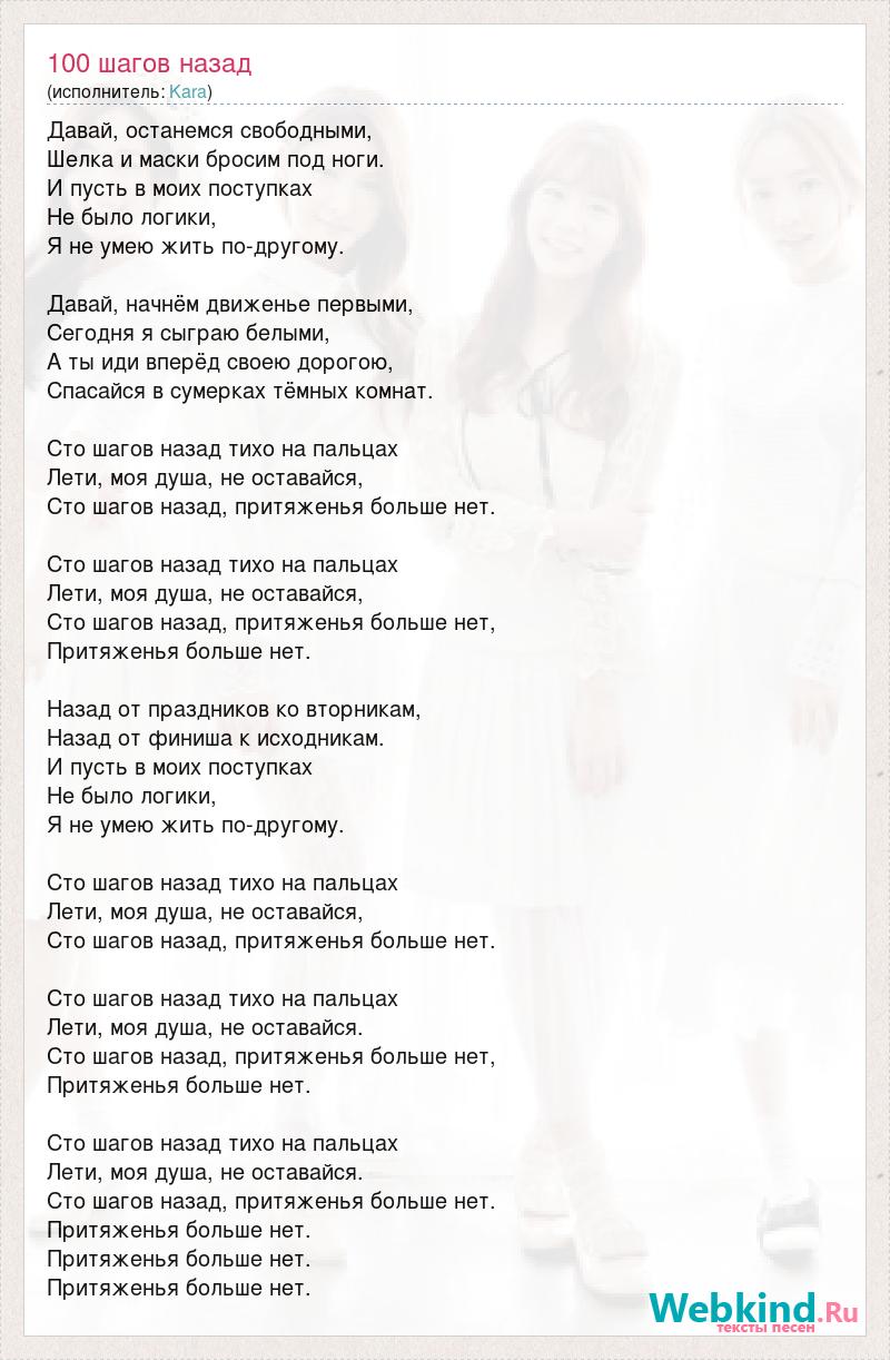 Давай, останемся свободными, Шелка и маски бросим под ноги. И пусть в моих поступках Не было логики, Я не умею жить по-другому. Давай, начнём движенье первыми, Сегодня я сыграю белыми, А ты иди вперёд своею дорогою, Спасайся в сумерках тёмных комнат. Сто шагов назад тихо на пальцах Лети, моя душа, не оставайся, Сто шагов назад, притяженья больше нет. Сто шагов назад тихо на пальцах Лети, моя душа, не оставайся, Сто шагов назад, притяженья больше нет, Притяженья больше нет. Назад от праздников ко вторникам, Назад от финиша к исходникам. И пусть в моих поступках Не было логики, Я не умею жить по-другому. Сто шагов назад тихо на пальцах Лети, моя душа, не оставайся, Сто шагов назад, притяженья больше нет. Сто шагов назад тихо на пальцах Лети, моя душа, не оставайся. Сто шагов назад, притяженья больше нет, Притяженья больше нет. Сто шагов назад тихо на пальцах Лети, моя душа, не оставайся. Сто шагов назад, притяженья больше нет. Притяженья больше нет. Притяженья больше нет. Притяженья больше нет.