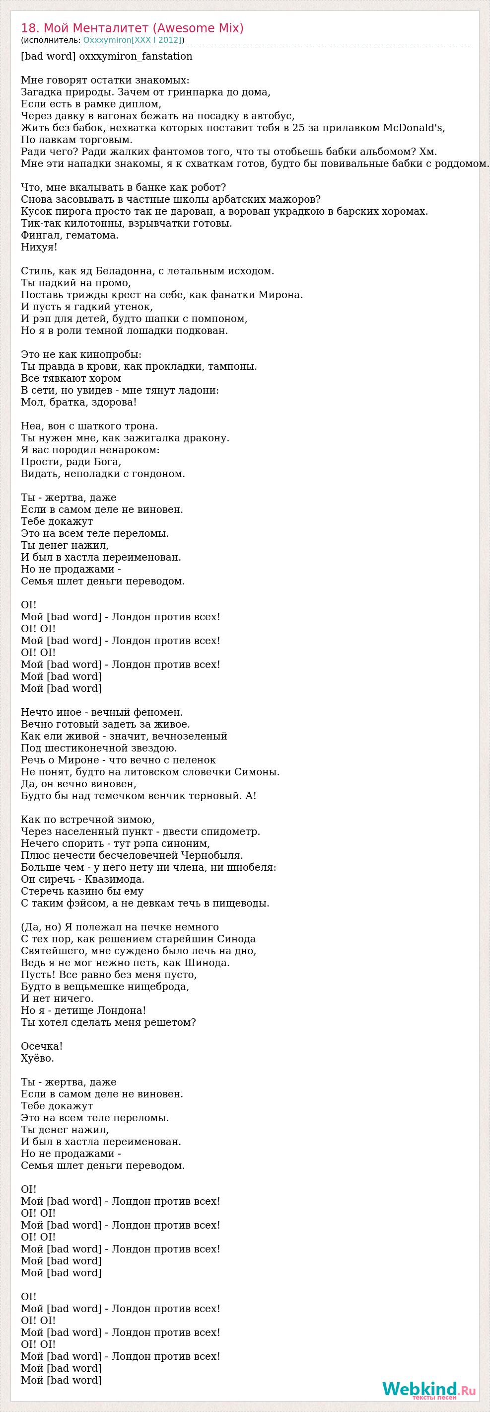 [bad word] oxxxymiron_fanstation Мне говорят остатки знакомых: Загадка природы. Зачем от гринпарка до дома, Если есть в рамке диплом, Через давку в вагонах бежать на посадку в автобус, Жить без бабок, нехватка которых поставит тебя в 25 за прилавком McDonald's, По лавкам торговым. Ради чего? Ради жалких фантомов того, что ты отобьешь бабки альбомом? Хм. Мне эти нападки знакомы, я к схваткам готов, будто бы повивальные бабки с роддомом. Что, мне вкалывать в банке как робот? Снова засовывать в частные школы арбатских мажоров? Кусок пирога просто так не дарован, а ворован украдкою в барских хоромах. Тик-так килотонны, взрывчатки готовы. Фингал, гематома. Нихуя! Стиль, как яд Беладонна, с летальным исходом. Ты падкий на промо, Поставь трижды крест на себе, как фанатки Мирона. И пусть я гадкий утенок, И рэп для детей, будто шапки с помпоном, Но я в роли темной лошадки подкован. Это не как кинопробы: Ты правда в крови, как прокладки, тампоны. Все тявкают хором В сети, но увидев - мне тянут ладони: Мол, братка, здорова! Неа, вон с шаткого трона. Ты нужен мне, как зажигалка дракону. Я вас породил ненароком: Прости, ради Бога, Видать, неполадки с гондоном. Ты - жертва, даже Если в самом деле не виновен. Тебе докажут Это на всем теле переломы. Ты денег нажил, И был в хастла переименован. Но не продажами - Семья шлет деньги переводом. OI! Мой [bad word] - Лондон против всех! OI! OI! Мой [bad word] - Лондон против всех! OI! OI! Мой [bad word] - Лондон против всех! Мой [bad word] Мой [bad word] Нечто иное - вечный феномен. Вечно готовый задеть за живое. Как ели живой - значит, вечнозеленый Под шестиконечной звездою. Речь о Мироне - что вечно с пеленок Не понят, будто на литовском словечки Симоны. Да, он вечно виновен, Будто бы над темечком венчик терновый. А! Как по встречной зимою, Через населенный пункт - двести спидометр. Нечего спорить - тут рэпа синоним, Плюс нечести бесчеловечней Чернобыля. Больше чем - у него нету ни члена, ни шнобеля: Он сиречь - Квазимода. Стеречь казино бы ему С таким фэйсом, а не девкам течь в пищеводы. (Да, но) Я полежал на печке немного С тех пор, как решением старейшин Синода Святейшего, мне суждено было лечь на дно, Ведь я не мог нежно петь, как Шинода. Пусть! Все равно без меня пусто, Будто в вещьмешке нищеброда, И нет ничего. Но я - детище Лондона! Ты хотел сделать меня решетом? Осечка! Хуёво. Ты - жертва, даже Если в самом деле не виновен. Тебе докажут Это на всем теле переломы. Ты денег нажил, И был в хастла переименован. Но не продажами - Семья шлет деньги переводом. OI! Мой [bad word] - Лондон против всех! OI! OI! Мой [bad word] - Лондон против всех! OI! OI! Мой [bad word] - Лондон против всех! Мой [bad word] Мой [bad word] OI! Мой [bad word] - Лондон против всех! OI! OI! Мой [bad word] - Лондон против всех! OI! OI! Мой [bad word] - Лондон против всех! Мой [bad word] Мой [bad word]