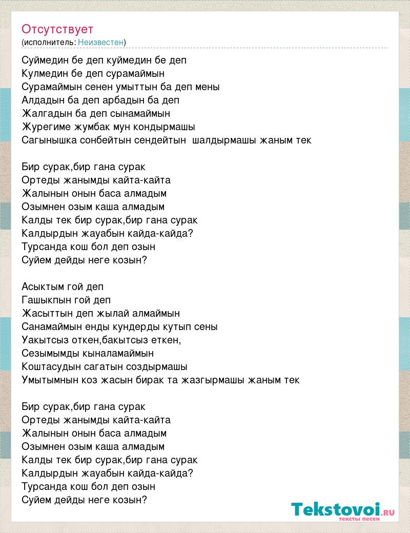 Суймедин бе деп куймедин бе деп Кулмедин бе деп сурамаймын Сурамаймын сенен умыттын ба деп мены Алдадын ба деп арбадын ба деп Жалгадын ба деп сынамаймын Журегиме жумбак мун кондырмашы Сагынышка сонбейтын сендейтын шалдырмашы жаным тек Бир сурак,бир гана сурак Ортеды жанымды кайта-кайта Жалынын онын баса алмадым Озымнен озым каша алмадым Калды тек бир сурак,бир гана сурак Калдырдын жауабын кайда-кайда? Турсанда кош бол деп озын Суйем дейды неге козын? Асыктым гой деп Гашыкпын гой деп Жасыттын деп жылай алмаймын Санамаймын енды кундерды кутып сены Уакытсыз откен,бакытсыз еткен, Сезымымды кыналамаймын Коштасудын сагатын создырмашы Умытымнын коз жасын бирак та жазгырмашы жаным тек Бир сурак,бир гана сурак Ортеды жанымды кайта-кайта Жалынын онын баса алмадым Озымнен озым каша алмадым Калды тек бир сурак,бир гана сурак Калдырдын жауабын кайда-кайда? Турсанда кош бол деп озын Суйем дейды неге козын?