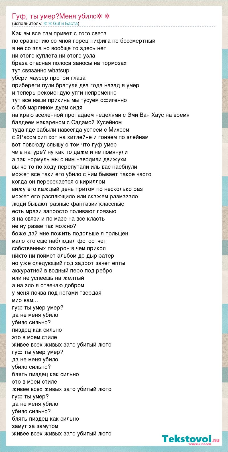 Как вы все там привет с того света по сравнению со мной горец нифига не бессмертный я не со зла но вообще то здесь нет ни этого куплета ни этого узла браза опасная полоса заносы на тормозах тут связанно whatsup убери маузер протри глаза прибереги пули братуля два года назад я умер и теперь рекомендую угги непременно тут все наши прикинь мы тусуем офигенно с боб марлином дуем сидя на краю вселенной пропадаем неделями с Эми Ван Хаус на время балдеем макареном с Садамой Хусейном туда где забыли навсегда успеем с Михеем с 2Pacом хип хоп на хитлейне и гоняем по элейнам вот повсюду слышу о том что гуф умер че в натуре? ну как то даже и не помянули а так нормуль мы с ним наводили движухи вы че то по ходу перепутали иль вас наебнули может все таки его убило с ним бывает такое часто когда он пересекается с кириллом вижу его каждый день притом по несколько раз может его расплющило или скажем размазало люди бывают разные фантазии классные есть мрази запросто поливают грязью я на связи и по мазе на все класть не ну разве так можно? боже дай мне пожить подольше я польщен мало кто еще наблюдал фотоотчет собственных похорон в чем прикол никто ни поймет альбом до дыр затер но уже следующий год задрот зачет епты аккуратней в водный перо под ребро или не успеешь на желтый а на зло я отвечаю добром у меня почва под ногами твердая мир вам... гуф ты умер умер? да не меня убило убило сильно? пиздец как сильно это в моем стиле живее всех живых зато убитый люто гуф ты умер умер? да не меня убило убило сильно? блять пиздец как сильно это в моем стиле живее всех живых зато убитый люто гуф ты умер? да не меня убило убило сильно? блять пиздец как сильно замут за замутом живее всех живых зато убитый люто