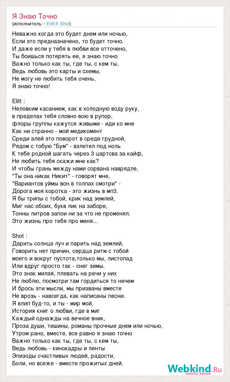 Неважно когда это будет днем или ночью, Если это предназначено, то будет точно. И даже если у тебя в любви все отточено, Ты боишься потерять ее, я знаю точно Важно только как ты, где ты, с кем ты, Ведь любовь это карты и схемы, Не могу не любить тебя очень, Я знаю точно! Elitt : Неловким касанием, как в холодную воду руку, в пределах тебя словно вою в рупор, флоры группы кажутся живыми - иди ко мне Как ни странно - мой медикомент Среди алей это поворот в среде грудной, Рядом с тобую *Бум* - взлетел под ноль К тебе родной шагать через 3 цартсва за кайф, Не любить тебя скажи мне как? И чтобы грань между нами сорвана наврядле, *Ты она никак Никит* - говорят мне, *Вариантов уймы вон в толпах смотри* - Дорога моя коротка - это жизнь в мп3. Я бы трипы с тобой, крик над землей, Миг нас обоих, букв лик на заборе, Тонны литров запои ни за что не променял. Это жизнь про тебя про меня... Shot : Дарить солнца луч и парить над землей, Говорить нет причин, сердца ритм с тобой моего и вокруг пустота,только мы, листопад Или вдруг просто так - снег зимы. Это знак милая, плевать на речи у них Не люблю, посмотри там гордиться то нечем И брось эти мысли, мы призваны вместе Не врозь - навсегда, как написаны песни. Я влип буд-то, и ты - мир мой, История книг о любви, где в миг Каждый однажды на вечное вник, Проза души, тишины, романы прочные днем или ночью, Утром рано, вместе, все равно я знаю точно Важно только как ты, где ты, с кем ты, Ведь любовь - кинокадры и ленты Эпизоды счастливых людей, радости, Боли, но всеже - вместе прожитых дней.