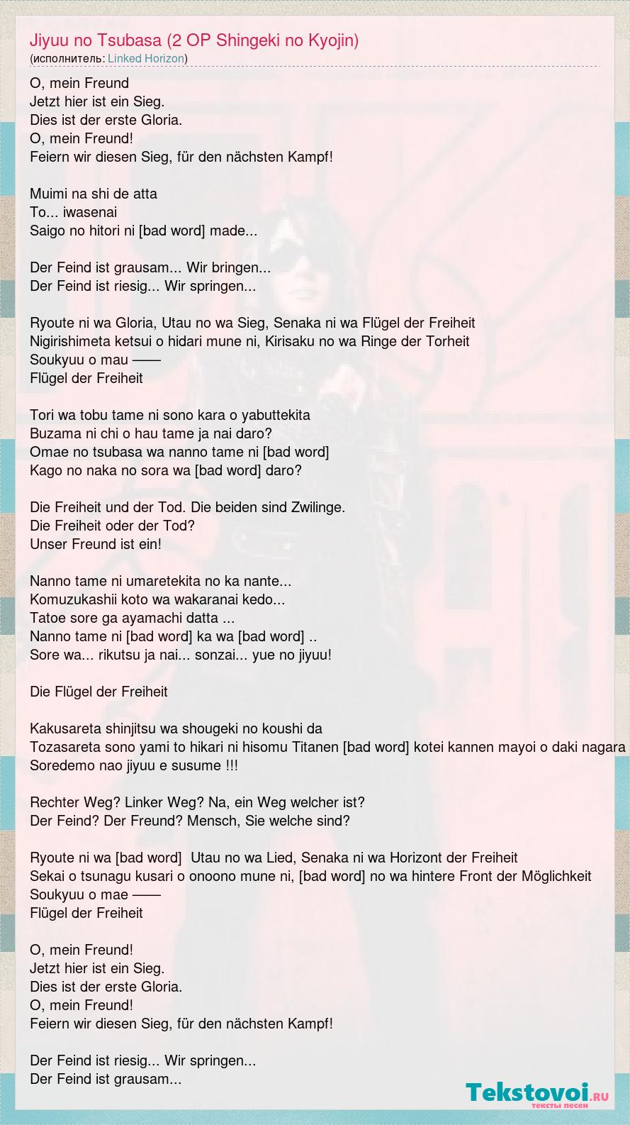 O, mein Freund Jetzt hier ist ein Sieg. Dies ist der erste Gloria. O, mein Freund! Feiern wir diesen Sieg, für den nächsten Kampf! Muimi na shi de atta To... iwasenai Saigo no hitori ni [bad word] made... Der Feind ist grausam... Wir bringen... Der Feind ist riesig... Wir springen... Ryoute ni wa Gloria, Utau no wa Sieg, Senaka ni wa Flügel der Freiheit Nigirishimeta ketsui o hidari mune ni, Kirisaku no wa Ringe der Torheit Soukyuu o mau —— Flügel der Freiheit Tori wa tobu tame ni sono kara o yabuttekita Buzama ni chi o hau tame ja nai daro? Omae no tsubasa wa nanno tame ni [bad word] Kago no naka no sora wa [bad word] daro? Die Freiheit und der Tod. Die beiden sind Zwilinge. Die Freiheit oder der Tod? Unser Freund ist ein! Nanno tame ni umaretekita no ka nante... Komuzukashii koto wa wakaranai kedo... Tatoe sore ga ayamachi datta ... Nanno tame ni [bad word] ka wa [bad word] .. Sore wa... rikutsu ja nai... sonzai... yue no jiyuu! Die Flügel der Freiheit Kakusareta shinjitsu wa shougeki no koushi da Tozasareta sono yami to hikari ni hisomu Titanen [bad word] kotei kannen mayoi o daki nagara Soredemo nao jiyuu e susume !!! Rechter Weg? Linker Weg? Na, ein Weg welcher ist? Der Feind? Der Freund? Mensch, Sie welche sind? Ryoute ni wa [bad word] Utau no wa Lied, Senaka ni wa Horizont der Freiheit Sekai o tsunagu kusari o onoono mune ni, [bad word] no wa hintere Front der Möglichkeit Soukyuu o mae —— Flügel der Freiheit O, mein Freund! Jetzt hier ist ein Sieg. Dies ist der erste Gloria. O, mein Freund! Feiern wir diesen Sieg, für den nächsten Kampf! Der Feind ist riesig... Wir springen... Der Feind ist grausam...