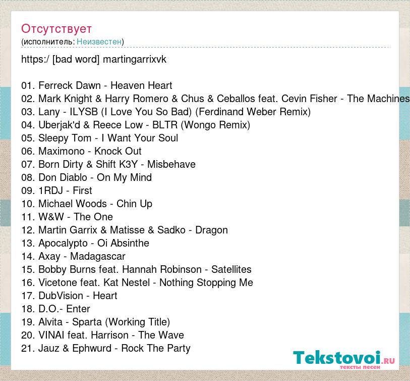 https:/ [bad word] martingarrixvk 01. Ferreck Dawn - Heaven Heart 02. Mark Knight & Harry Romero & Chus & Ceballos feat. Cevin Fisher - The Machines 03. Lany - ILYSB (I Love You So Bad) (Ferdinand Weber Remix) 04. Uberjak'd & Reece Low - BLTR (Wongo Remix) 05. Sleepy Tom - I Want Your Soul 06. Maximono - Knock Out 07. Born Dirty & Shift K3Y - Misbehave 08. Don Diablo - On My Mind 09. 1RDJ - First 10. Michael Woods - Chin Up 11. W&W - The One 12. Martin Garrix & Matisse & Sadko - Dragon 13. Apocalypto - Oi Absinthe 14. Axay - Madagascar 15. Bobby Burns feat. Hannah Robinson - Satellites 16. Vicetone feat. Kat Nestel - Nothing Stopping Me 17. DubVision - Heart 18. D.O.- Enter 19. Alvita - Sparta (Working Title) 20. VINAI feat. Harrison - The Wave 21. Jauz & Ephwurd - Rock The Party