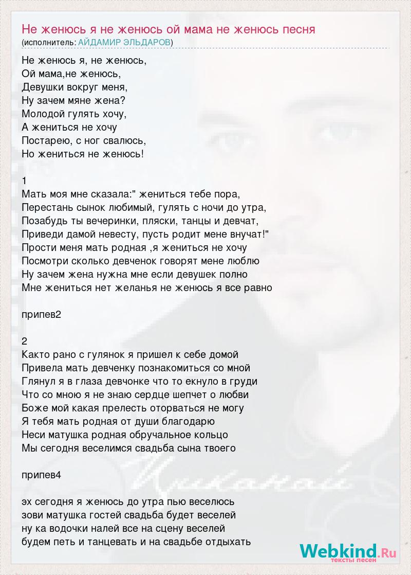 Не женюсь я, не женюсь, Ой мама,не женюсь, Девушки вокруг меня, Ну зачем мяне жена? Молодой гулять хочу, А жениться не хочу Постарею, с ног свалюсь, Но жениться не женюсь! 1 Мать моя мне сказала:" жениться тебе пора, Перестань сынок любимый, гулять с ночи до утра, Позабудь ты вечеринки, пляски, танцы и девчат, Приведи дамой невесту, пусть родит мене внучат!" Прости меня мать родная ,я жениться не хочу Посмотри сколько девченок говорят мене люблю Ну зачем жена нужна мне если девушек полно Мне жениться нет желанья не женюсь я все равно припев2 2 Както рано с гулянок я пришел к себе домой Привела мать девченку познакомиться со мной Глянул я в глаза девчонке что то екнуло в груди Что со мною я не знаю сердце шепчет о любви Боже мой какая прелесть оторваться не могу Я тебя мать родная от души благодарю Неси матушка родная обручальное кольцо Мы сегодня веселимся свадьба сына твоего припев4 эх сегодня я женюсь до утра пью веселюсь зови матушка гостей свадьба будет веселей ну ка водочки налей все на сцену веселей будем петь и танцевать и на свадьбе отдыхать