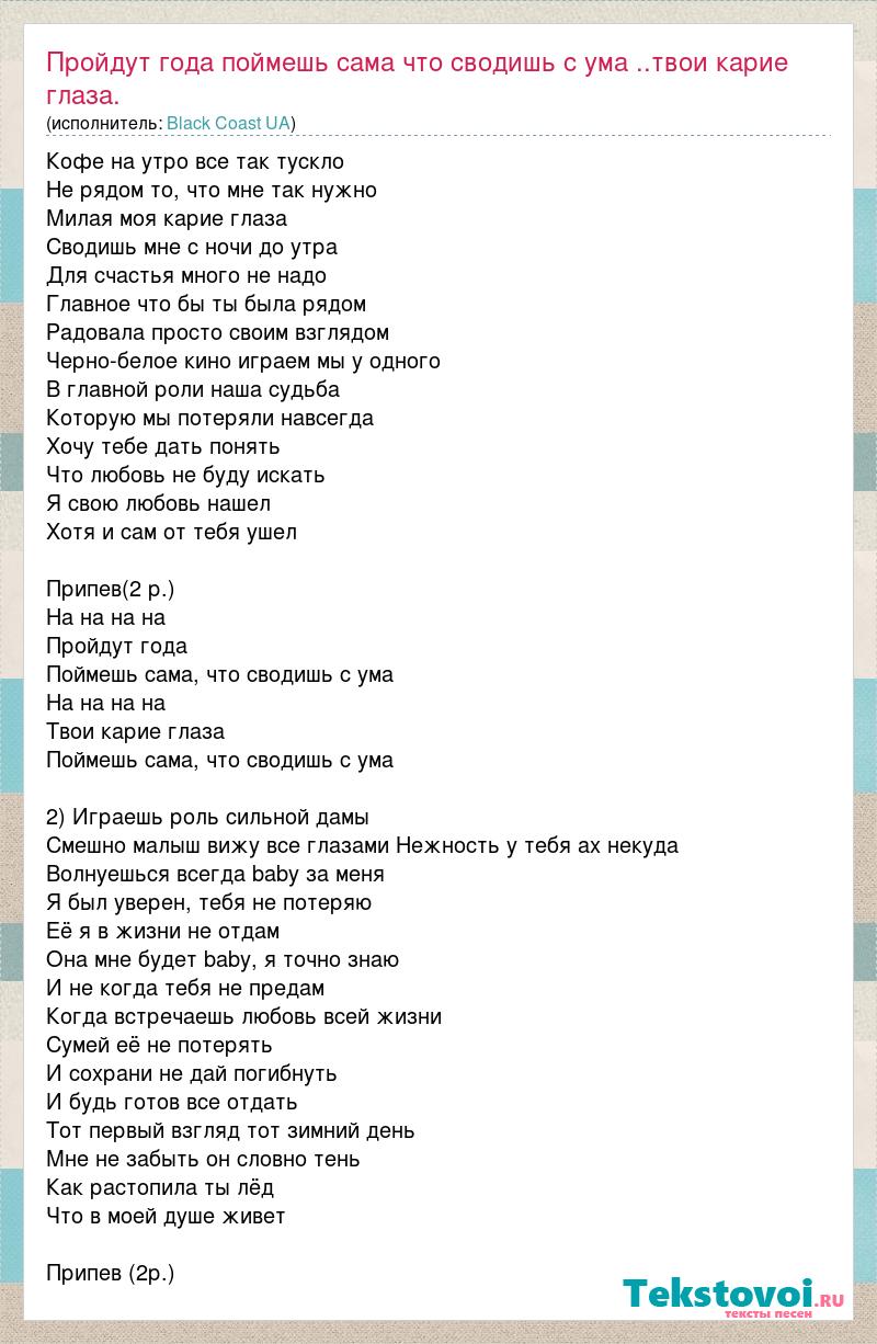 Кофе на утро все так тускло Не рядом то, что мне так нужно Милая моя карие глаза Сводишь мне с ночи до утра Для счастья много не надо Главное что бы ты была рядом Радовала просто своим взглядом Черно-белое кино играем мы у одного В главной роли наша судьба Которую мы потеряли навсегда Хочу тебе дать понять Что любовь не буду искать Я свою любовь нашел Хотя и сам от тебя ушел Припев(2 р.) На на на на Пройдут года Поймешь сама, что сводишь с ума На на на на Твои карие глаза Поймешь сама, что сводишь с ума 2) Играешь роль сильной дамы Смешно малыш вижу все глазами Нежность у тебя ах некуда Волнуешься всегда baby за меня Я был уверен, тебя не потеряю Её я в жизни не отдам Она мне будет baby, я точно знаю И не когда тебя не предам Когда встречаешь любовь всей жизни Сумей её не потерять И сохрани не дай погибнуть И будь готов все отдать Тот первый взгляд тот зимний день Мне не забыть он словно тень Как растопила ты лёд Что в моей душе живет Припев (2р.)