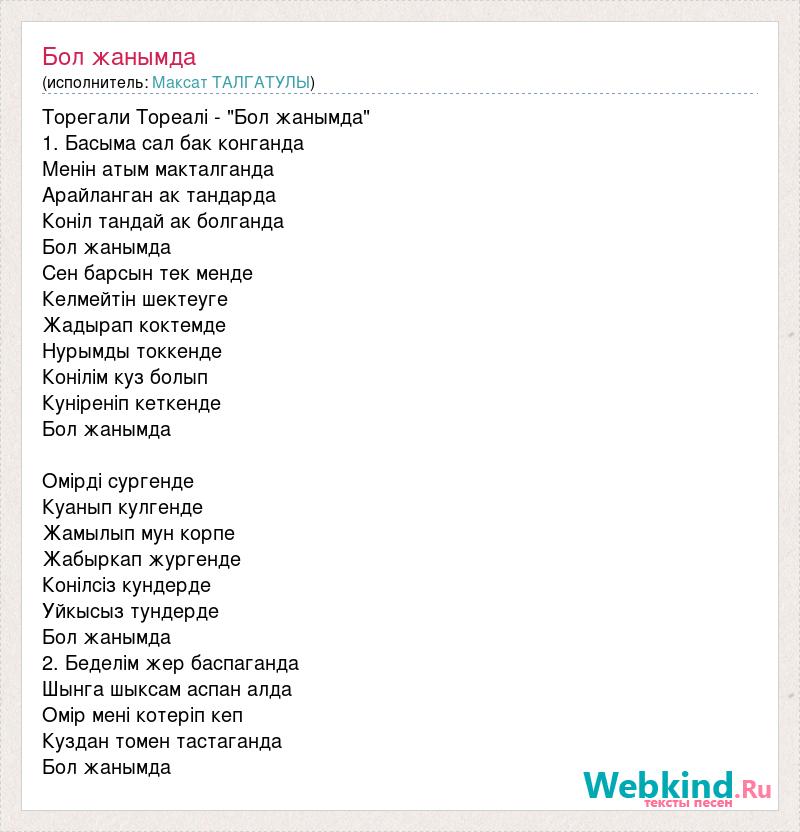 Торегали Тореалі - "Бол жанымда" 1. Басыма сал бак конганда Менін атым макталганда Арайланган ак тандарда Коніл тандай ак болганда Бол жанымда Сен барсын тек менде Келмейтін шектеуге Жадырап коктемде Нурымды токкенде Конілім куз болып Куніреніп кеткенде Бол жанымда Омірді сургенде Куанып кулгенде Жамылып мун корпе Жабыркап жургенде Конілсіз кундерде Уйкысыз тундерде Бол жанымда 2. Беделім жер баспаганда Шынга шыксам аспан алда Омір мені котеріп кеп Куздан томен тастаганда Бол жанымда
