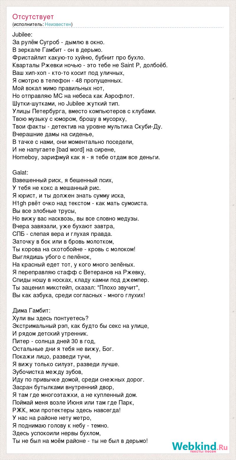 Jubilee: За рулём Сугроб - дымлю в окно. В зеркале Гамбит - он в дерьмо. Фристайлит какую-то хуйню, бубнит про бухло. Кварталы Ржевки ночью - это тебе не Saint P, долбоёб. Ваш хип-хоп - кто-то косит под уличных, Я смотрю в телефон - 48 пропущенных. Мой вокал мимо правильных нот, Но отправляю МС на небеса как Аэрофлот. Шутки-шутками, но Jubilee жуткий тип. Улицы Петербурга, вместо компьютеров с клубами. Твою музыку с юмором, брошу в мусорку, Твои факты - детектив на уровне мультика Скуби-Ду. Вчерашние дамы на сиденье, В тачке с нами, они моментально поседели, И не напугаете [bad word] на сирене, Homeboy, зарифмуй как я - я тебе отдам все деньги. Galat: Взвешенный риск, я бешенный псих, У тебя не кокс а мешанный рис. Я юрист, и ты должен знать сумму иска, H1gh рвёт очко над текстом - как мать сумоиста. Вы все злобные трусы, Но вижу вас насквозь, вы все словно медузы. Вчера завязали, уже бухают завтра, СПБ - слепая вера и глухая правда. Заточку в бок или в бровь молотком, Ты корова на скотобойне - кровь с молоком! Выглядишь убого с пелёнок, На красный едет тот, у кого много зелёных. Я переправляю стафф с Ветеранов на Ржевку, Спиды ношу в носках, кладу камни под джемпер. Ты заценил микстейп, сказал: "Плохо звучит", Вы как азбука, среди согласных - много глухих! Дима Гамбит: Хули вы здесь понтуетесь? Экстримальный рэп, как будто бы секс на улице, И рядом детский утренник. Питер - солнца дней 30 в год, Остальные дни я тебя не вижу, Бог. Покажи лицо, разведи тучи, Я вижу только силуэт, разведи лучше. Зубочистка между зубов, Иду по привычке домой, среди снежных дорог. Засран бутылками внутренний двор, Я там где многоэтажки, а не купленный дом. Поймай меня возле Июня или там где Парк, РЖК, мои протектеры здесь навсегда! У нас на районе нету метро, Я поднимаю голову к небу - темно. Здесь успокоили нервы бухлом, Ты не был на моём районе - ты не был в дерьмо!