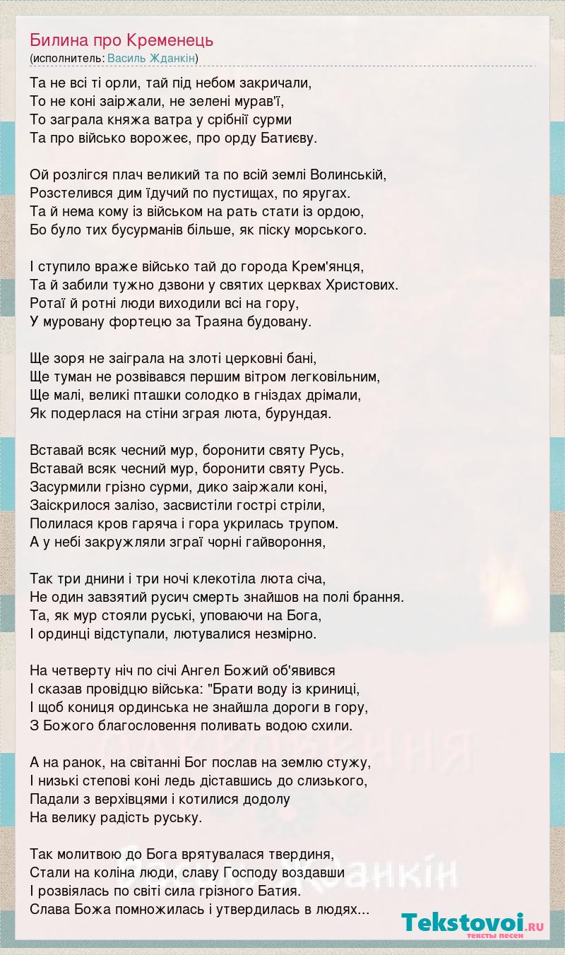 Та не всі ті орли, тай під небом закричали, То не коні заіржали, не зелені мурав'ї, То заграла княжа ватра у срібнії сурми Та про військо ворожеє, про орду Батиєву. Ой розлігся плач великий та по всій землі Волинській, Розстелився дим їдучий по пустищах, по яругах. Та й нема кому із військом на рать стати із ордою, Бо було тих бусурманів більше, як піску морського. І ступило враже військо тай до города Крем'янця, Та й забили тужно дзвони у святих церквах Христових. Ротаї й ротні люди виходили всі на гору, У муровану фортецю за Траяна будовану. Ще зоря не заіграла на злоті церковні бані, Ще туман не розвівався першим вітром легковільним, Ще малі, великі пташки солодко в гніздах дрімали, Як подерлася на стіни зграя люта, бурундая. Вставай всяк чесний мур, боронити святу Русь, Вставай всяк чесний мур, боронити святу Русь. Засурмили грізно сурми, дико заіржали коні, Заіскрилося залізо, засвистіли гострі стріли, Полилася кров гаряча і гора укрилась трупом. А у небі закружляли зграї чорні гайвороння, Так три днини і три ночі клекотіла люта січа, Не один завзятий русич смерть знайшов на полі брання. Та, як мур стояли руські, уповаючи на Бога, І ординці відступали, лютувалися незмірно. На четверту ніч по січі Ангел Божий об'явився І сказав провідцю війська: "Брати воду із криниці, І щоб кониця ординська не знайшла дороги в гору, З Божого благословення поливать водою схили. А на ранок, на світанні Бог послав на землю стужу, І низькі степові коні ледь діставшись до слизького, Падали з верхівцями і котилися додолу На велику радість руську. Так молитвою до Бога врятувалася твердиня, Стали на коліна люди, славу Господу воздавши І розвіялась по світі сила грізного Батия. Слава Божа помножилась і утвердилась в людях...
