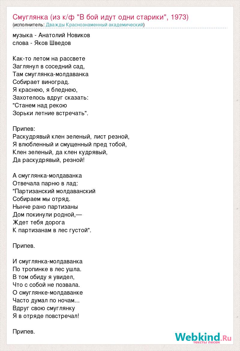 музыка - Анатолий Новиков слова - Яков Шведов Как-то летом на рассвете Заглянул в соседний сад, Там смуглянка-молдаванка Собирает виноград. Я краснею, я бледнею, Захотелось вдруг сказать: "Станем над рекою Зорьки летние встречать". Припев: Раскудрявый клен зеленый, лист резной, Я влюбленный и смущенный пред тобой, Клен зеленый, да клен кудрявый, Да раскудрявый, резной! А смуглянка-молдаванка Отвечала парню в лад: "Партизанский молдаванский Собираем мы отряд. Нынче рано партизаны Дом покинули родной,— Ждет тебя дорога К партизанам в лес густой". Припев. И смуглянка-молдаванка По тропинке в лес ушла. В том обиду я увидел, Что с собой не позвала. О смуглянке-молдаванке Часто думал по ночам... Вдруг свою смуглянку Я в отряде повстречал! Припев.