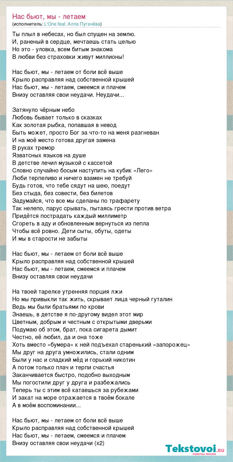 Ты плыл в небесах, но был спущен на землю. И, раненый в сердце, мечтаешь стать целью Но это - уловка, всем битым знакома В любви без страховки живут миллионы! Нас бьют, мы - летаем от боли всё выше Крыло расправляя над собственной крышей Нас бьют, мы - летаем, смеемся и плачем Внизу оставляя свои неудачи. Неудачи... Затянуло чёрным небо Любовь бывает только в сказках Как золотая рыбка, попавшая в невод Быть может, просто Бог за что-то на меня разгневан И на моё место готова другая замена В руках тремор Язватсных языков на душе В детстве лечил музыкой с кассетой Словно случайно босым наступить на кубик «Лего» Люби терпеливо и ничего взамен не требуй Будь готов, что тебе сядут на шею, поедут Без стыда, без совести, без билетов Задумайся, что все мы сделаны по трафарету Так нелепо, парус срывать, пытаясь грести против ветра Придётся пострадать каждый миллиметр Сгореть в аду и обновленным вернуться из пепла Чтобы всё ровно. Дети сыты, обуты, одеты И мы в старости не забыты Нас бьют, мы - летаем от боли всё выше Крыло расправляя над собственной крышей Нас бьют, мы - летаем, смеемся и плачем Внизу оставляя свои неудачи На твоей тарелке утренняя порция лжи Но мы привыкли так жить, скрывает лица черный гуталин Ведь мы были братьями по крови Знаешь, в детстве я по-другому видел этот мир Цветным, добрым и честным с открытыми дверьми Подумаю об этом, брат, пока сигарета дымит Честно, её любил, да и она тоже Хоть вместо «бумера» к ней подъехал старенький «запорожец» Мы друг на друга умножились, стали одним Были у нас и сладкий мёд и горький никотин А потом только плач и терпи счастья Заканчивается быстро, подобно выходным Мы погостили друг у друга и разбежались Теперь ты с этим всё катаешься за рубежами И закат на море отражается в твоём бокале А в моём воспоминании... Нас бьют, мы - летаем от боли всё выше Крыло расправляя над собственной крышей Нас бьют, мы - летаем, смеемся и плачем Внизу оставляя свои неудачи (х2)