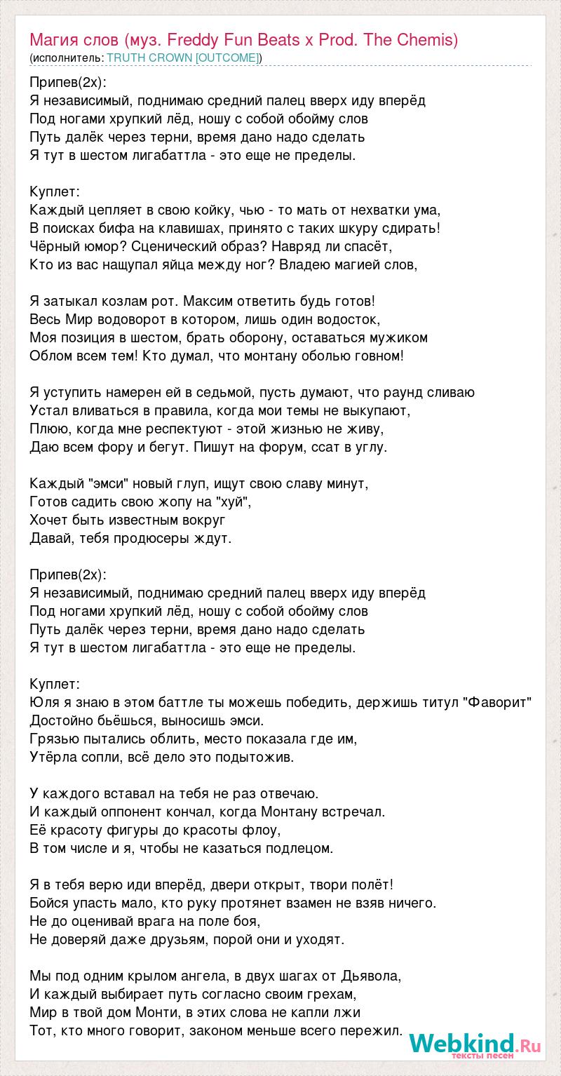 Припев(2х): Я независимый, поднимаю средний палец вверх иду вперёд Под ногами хрупкий лёд, ношу с собой обойму слов Путь далёк через терни, время дано надо сделать Я тут в шестом лигабаттла - это еще не пределы. Куплет: Каждый цепляет в свою койку, чью - то мать от нехватки ума, В поисках бифа на клавишах, принято с таких шкуру сдирать! Чёрный юмор? Сценический образ? Навряд ли спасёт, Кто из вас нащупал яйца между ног? Владею магией слов, Я затыкал козлам рот. Максим ответить будь готов! Весь Мир водоворот в котором, лишь один водосток, Моя позиция в шестом, брать оборону, оставаться мужиком Облом всем тем! Кто думал, что монтану оболью говном! Я уступить намерен ей в седьмой, пусть думают, что раунд сливаю Устал вливаться в правила, когда мои темы не выкупают, Плюю, когда мне респектуют - этой жизнью не живу, Даю всем фору и бегут. Пишут на форум, ссат в углу. Каждый "эмси" новый глуп, ищут свою славу минут, Готов садить свою жопу на "хуй", Хочет быть известным вокруг Давай, тебя продюсеры ждут. Припев(2х): Я независимый, поднимаю средний палец вверх иду вперёд Под ногами хрупкий лёд, ношу с собой обойму слов Путь далёк через терни, время дано надо сделать Я тут в шестом лигабаттла - это еще не пределы. Куплет: Юля я знаю в этом баттле ты можешь победить, держишь титул "Фаворит" Достойно бьёшься, выносишь эмси. Грязью пытались облить, место показала где им, Утёрла сопли, всё дело это подытожив. У каждого вставал на тебя не раз отвечаю. И каждый оппонент кончал, когда Монтану встречал. Её красоту фигуры до красоты флоу, В том числе и я, чтобы не казаться подлецом. Я в тебя верю иди вперёд, двери открыт, твори полёт! Бойся упасть мало, кто руку протянет взамен не взяв ничего. Не до оценивай врага на поле боя, Не доверяй даже друзьям, порой они и уходят. Мы под одним крылом ангела, в двух шагах от Дьявола, И каждый выбирает путь согласно своим грехам, Мир в твой дом Монти, в этих слова не капли лжи Тот, кто много говорит, законом меньше всего пережил.