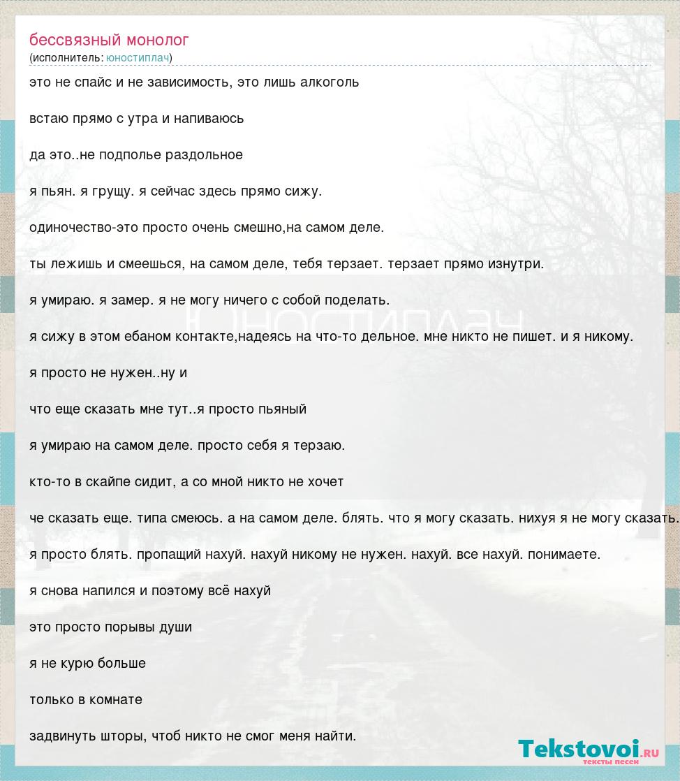 это не спайс и не зависимость, это лишь алкоголь встаю прямо с утра и напиваюсь да это..не подполье раздольное я пьян. я грущу. я сейчас здесь прямо сижу. одиночество-это просто очень смешно,на самом деле. ты лежишь и смеешься, на самом деле, тебя терзает. терзает прямо изнутри. я умираю. я замер. я не могу ничего с собой поделать. я сижу в этом ебаном контакте,надеясь на что-то дельное. мне никто не пишет. и я никому. я просто не нужен..ну и что еще сказать мне тут..я просто пьяный я умираю на самом деле. просто себя я терзаю. кто-то в скайпе сидит, а со мной никто не хочет че сказать еще. типа смеюсь. а на самом деле. блять. что я могу сказать. нихуя я не могу сказать. я просто блять. пропащий нахуй. нахуй никому не нужен. нахуй. все нахуй. понимаете. я снова напился и поэтому всё нахуй это просто порывы души я не курю больше только в комнате задвинуть шторы, чтоб никто не смог меня найти.