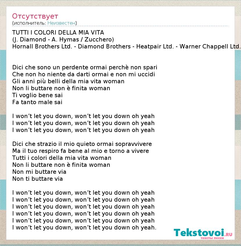 TUTTI I COLORI DELLA MIA VITA (J. Diamond - A. Hymas / Zucchero) Hornall Brothers Ltd. - Diamond Brothers - Heatpair Ltd. - Warner Chappell Ltd. Dici che sono un perdente ormai perchè non spari Che non ho niente da darti ormai e non mi uccidi Gli anni più belli della mia vita woman Non li buttare non è finita woman Ti voglio bene sai Fa tanto male sai I won’t let you down, won’t let you down oh yeah I won’t let you down, won’t let you down oh yeah I won’t let you down, won’t let you down oh yeah Dici che strazio il mio quieto ormai sopravvivere Ma il tuo respiro fa bene al mio e torno a vivere Tutti i colori della mia vita woman Non li buttare non è finita woman Non mi buttare via Non ti buttare via I won’t let you down, won’t let you down oh yeah I won’t let you down, won’t let you down oh yeah I won’t let you down, won’t let you down oh yeah I won’t let you down, won’t let you down oh yeah I won’t let you down, won’t let you down oh yeah I won’t let you down, won’t let you down oh yeah.