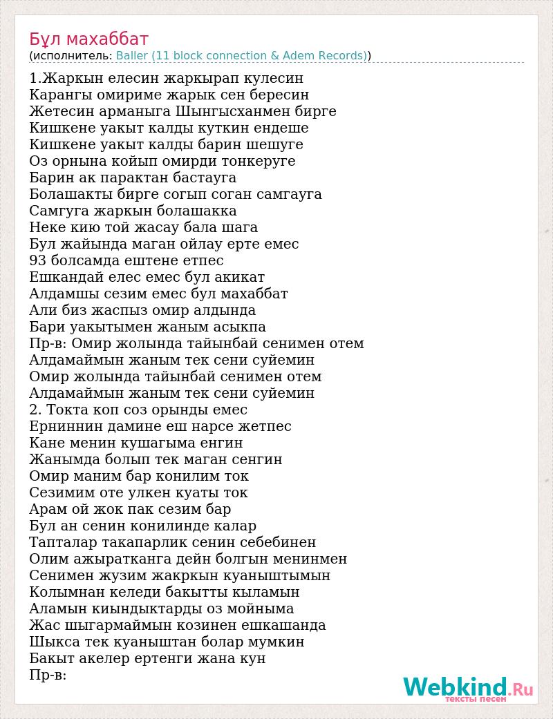 1.Жаркын елесин жаркырап кулесин Карангы омириме жарык сен бересин Жетесин арманыга Шынгысханмен бирге Кишкене уакыт калды куткин ендеше Кишкене уакыт калды барин шешуге Оз орнына койып омирди тонкеруге Барин ак парактан бастауга Болашакты бирге согып соган самгауга Самгуга жаркын болашакка Неке кию той жасау бала шага Бул жайында маган ойлау ерте емес 93 болсамда ештене етпес Ешкандай елес емес бул акикат Алдамшы сезим емес бул махаббат Али биз жаспыз омир алдында Бари уакытымен жаным асыкпа Пр-в: Омир жолында тайынбай сенимен отем Алдамаймын жаным тек сени суйемин Омир жолында тайынбай сенимен отем Алдамаймын жаным тек сени суйемин 2. Токта коп соз орынды емес Ерниннин дамине еш нарсе жетпес Кане менин кушагыма енгин Жанымда болып тек маган сенгин Омир маним бар конилим ток Сезимим оте улкен куаты ток Арам ой жок пак сезим бар Бул ан сенин конилинде калар Тапталар такапарлик сенин себебинен Олим ажыратканга дейн болгын менинмен Сенимен жузим жакркын куаныштымын Колымнан келеди бакытты кыламын Аламын киындыктарды оз мойныма Жас шыгармаймын козинен ешкашанда Шыкса тек куаныштан болар мумкин Бакыт акелер ертенги жана кун Пр-в: