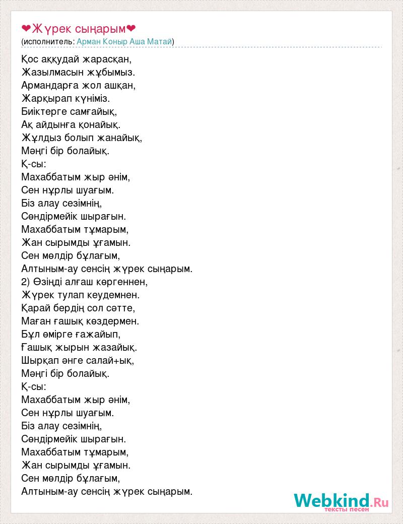 Қос аққудай жарасқан, Жазылмасын жұбымыз. Армандарға жол ашқан, Жарқырап күніміз. Биіктерге самғайық, Ақ айдынға қонайық. Жұлдыз болып жанайық, Мәңгі бір болайық. Қ-сы: Махаббатым жыр әнім, Сен нұрлы шуағым. Біз алау сезімнің, Сөндірмейік шырағын. Махаббатым тұмарым, Жан сырымды ұғамын. Сен мөлдір бұлағым, Алтыным-ау сенсің жүрек сыңарым. 2) Өзіңді алғаш көргеннен, Жүрек тулап кеудемнен. Қарай бердің сол сәтте, Маған ғашық көздермен. Бұл өмірге ғажайып, Ғашық жырын жазайық. Шырқап әнге салай+ық, Мәңгі бір болайық. Қ-сы: Махаббатым жыр әнім, Сен нұрлы шуағым. Біз алау сезімнің, Сөндірмейік шырағын. Махаббатым тұмарым, Жан сырымды ұғамын. Сен мөлдір бұлағым, Алтыным-ау сенсің жүрек сыңарым.