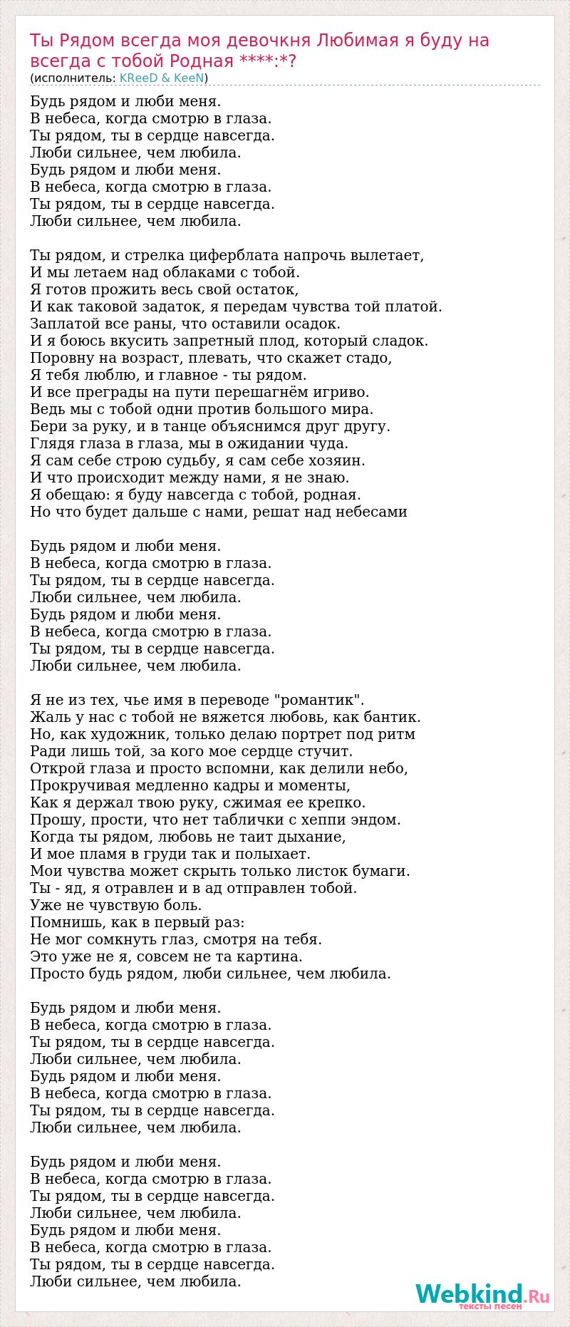 Будь рядом и люби меня. В небеса, когда смотрю в глаза. Ты рядом, ты в сердце навсегда. Люби сильнее, чем любила. Будь рядом и люби меня. В небеса, когда смотрю в глаза. Ты рядом, ты в сердце навсегда. Люби сильнее, чем любила. Ты рядом, и стрелка циферблата напрочь вылетает, И мы летаем над облаками с тобой. Я готов прожить весь свой остаток, И как таковой задаток, я передам чувства той платой. Заплатой все раны, что оставили осадок. И я боюсь вкусить запретный плод, который сладок. Поровну на возраст, плевать, что скажет стадо, Я тебя люблю, и главное - ты рядом. И все преграды на пути перешагнём игриво. Ведь мы с тобой одни против большого мира. Бери за руку, и в танце объяснимся друг другу. Глядя глаза в глаза, мы в ожидании чуда. Я сам себе строю судьбу, я сам себе хозяин. И что происходит между нами, я не знаю. Я обещаю: я буду навсегда с тобой, родная. Но что будет дальше с нами, решат над небесами Будь рядом и люби меня. В небеса, когда смотрю в глаза. Ты рядом, ты в сердце навсегда. Люби сильнее, чем любила. Будь рядом и люби меня. В небеса, когда смотрю в глаза. Ты рядом, ты в сердце навсегда. Люби сильнее, чем любила. Я не из тех, чье имя в переводе "романтик". Жаль у нас с тобой не вяжется любовь, как бантик. Но, как художник, только делаю портрет под ритм Ради лишь той, за кого мое сердце стучит. Открой глаза и просто вспомни, как делили небо, Прокручивая медленно кадры и моменты, Как я держал твою руку, сжимая ее крепко. Прошу, прости, что нет таблички с хеппи эндом. Когда ты рядом, любовь не таит дыхание, И мое пламя в груди так и полыхает. Мои чувства может скрыть только листок бумаги. Ты - яд, я отравлен и в ад отправлен тобой. Уже не чувствую боль. Помнишь, как в первый раз: Не мог сомкнуть глаз, смотря на тебя. Это уже не я, совсем не та картина. Просто будь рядом, люби сильнее, чем любила. Будь рядом и люби меня. В небеса, когда смотрю в глаза. Ты рядом, ты в сердце навсегда. Люби сильнее, чем любила. Будь рядом и люби меня. В небеса, когда смотрю в глаза. Ты рядом, ты в сердце навсегда. Люби сильнее, чем любила. Будь рядом и люби меня. В небеса, когда смотрю в глаза. Ты рядом, ты в сердце навсегда. Люби сильнее, чем любила. Будь рядом и люби меня. В небеса, когда смотрю в глаза. Ты рядом, ты в сердце навсегда. Люби сильнее, чем любила.