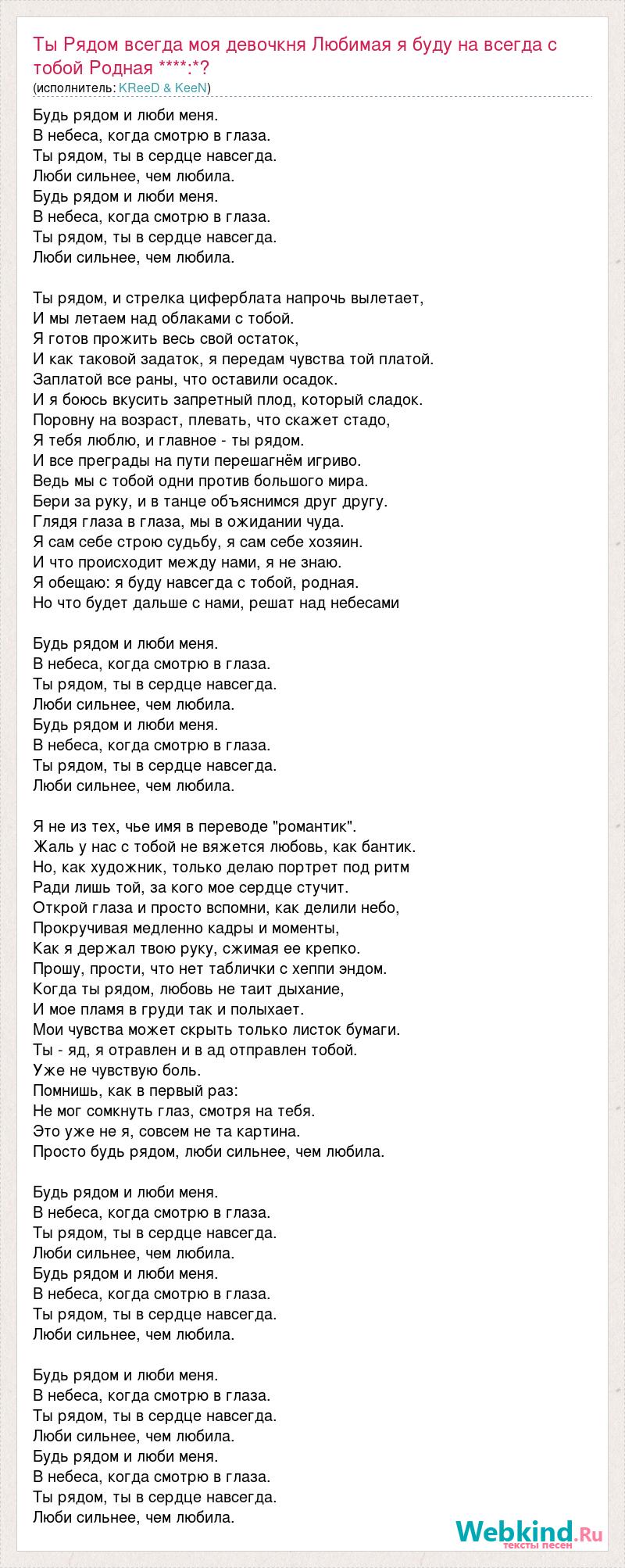 Будь рядом и люби меня. В небеса, когда смотрю в глаза. Ты рядом, ты в сердце навсегда. Люби сильнее, чем любила. Будь рядом и люби меня. В небеса, когда смотрю в глаза. Ты рядом, ты в сердце навсегда. Люби сильнее, чем любила. Ты рядом, и стрелка циферблата напрочь вылетает, И мы летаем над облаками с тобой. Я готов прожить весь свой остаток, И как таковой задаток, я передам чувства той платой. Заплатой все раны, что оставили осадок. И я боюсь вкусить запретный плод, который сладок. Поровну на возраст, плевать, что скажет стадо, Я тебя люблю, и главное - ты рядом. И все преграды на пути перешагнём игриво. Ведь мы с тобой одни против большого мира. Бери за руку, и в танце объяснимся друг другу. Глядя глаза в глаза, мы в ожидании чуда. Я сам себе строю судьбу, я сам себе хозяин. И что происходит между нами, я не знаю. Я обещаю: я буду навсегда с тобой, родная. Но что будет дальше с нами, решат над небесами Будь рядом и люби меня. В небеса, когда смотрю в глаза. Ты рядом, ты в сердце навсегда. Люби сильнее, чем любила. Будь рядом и люби меня. В небеса, когда смотрю в глаза. Ты рядом, ты в сердце навсегда. Люби сильнее, чем любила. Я не из тех, чье имя в переводе "романтик". Жаль у нас с тобой не вяжется любовь, как бантик. Но, как художник, только делаю портрет под ритм Ради лишь той, за кого мое сердце стучит. Открой глаза и просто вспомни, как делили небо, Прокручивая медленно кадры и моменты, Как я держал твою руку, сжимая ее крепко. Прошу, прости, что нет таблички с хеппи эндом. Когда ты рядом, любовь не таит дыхание, И мое пламя в груди так и полыхает. Мои чувства может скрыть только листок бумаги. Ты - яд, я отравлен и в ад отправлен тобой. Уже не чувствую боль. Помнишь, как в первый раз: Не мог сомкнуть глаз, смотря на тебя. Это уже не я, совсем не та картина. Просто будь рядом, люби сильнее, чем любила. Будь рядом и люби меня. В небеса, когда смотрю в глаза. Ты рядом, ты в сердце навсегда. Люби сильнее, чем любила. Будь рядом и люби меня. В небеса, когда смотрю в глаза. Ты рядом, ты в сердце навсегда. Люби сильнее, чем любила. Будь рядом и люби меня. В небеса, когда смотрю в глаза. Ты рядом, ты в сердце навсегда. Люби сильнее, чем любила. Будь рядом и люби меня. В небеса, когда смотрю в глаза. Ты рядом, ты в сердце навсегда. Люби сильнее, чем любила.