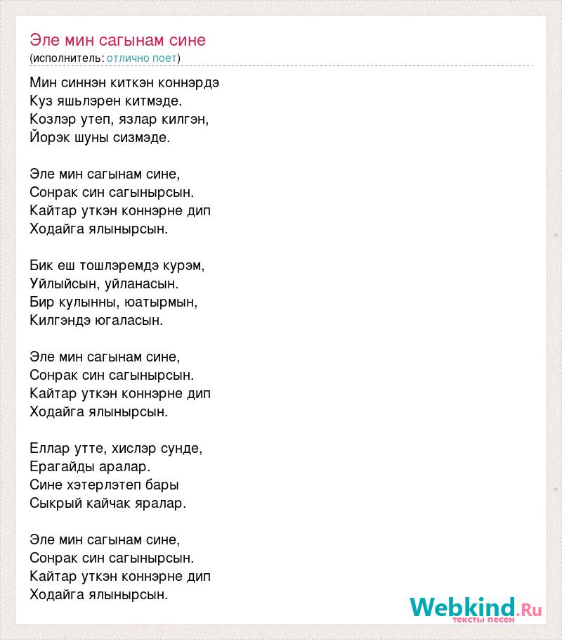 Мин синнэн киткэн коннэрдэ Куз яшьлэрен китмэде. Козлэр утеп, язлар килгэн, Йорэк шуны сизмэде. Эле мин сагынам сине, Сонрак син сагынырсын. Кайтар уткэн коннэрне дип Ходайга ялынырсын. Бик еш тошлэремдэ курэм, Уйлыйсын, уйланасын. Бир кулынны, юатырмын, Килгэндэ югаласын. Эле мин сагынам сине, Сонрак син сагынырсын. Кайтар уткэн коннэрне дип Ходайга ялынырсын. Еллар утте, хислэр сунде, Ерагайды аралар. Сине хэтерлэтеп бары Сыкрый кайчак яралар. Эле мин сагынам сине, Сонрак син сагынырсын. Кайтар уткэн коннэрне дип Ходайга ялынырсын.