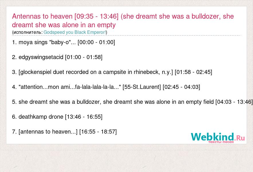 Главная→Исполнители→Godspeed you Black Emperor!→Antennas to heaven [09:35 - 13:46] (she dreamt she was a bulldozer, she