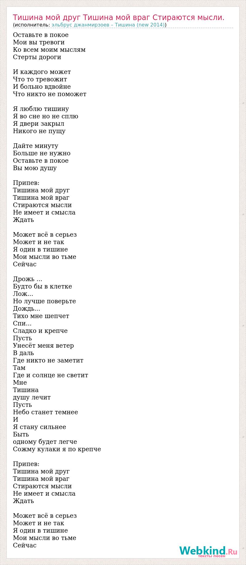 Оставьте в покое Мои вы тревоги Ко всем моим мыслям Стерты дороги И каждого может Что то тревожит И больно вдвойне Что никто не поможет Я люблю тишину Я во сне но не сплю Я двери закрыл Никого не пущу Дайте минуту Больше не нужно Оставьте в покое Вы мою душу Припев: Тишина мой друг Тишина мой враг Стираются мысли Не имеет и смысла Ждать Может всё в серьез Может и не так Я один в тишине Мои мысли во тьме Сейчас Дрожь ... Будто бы в клетке Лож... Но лучше поверьте Дождь... Тихо мне шепчет Спи... Сладко и крепче Пусть Унесёт меня ветер В даль Где никто не заметит Там Где и солнце не светит Мне Тишина душу лечит Пусть Небо станет темнее И Я стану сильнее Быть одному будет легче Сожму кулаки я по крепче Припев: Тишина мой друг Тишина мой враг Стираются мысли Не имеет и смысла Ждать Может всё в серьез Может и не так Я один в тишине Мои мысли во тьме Сейчас