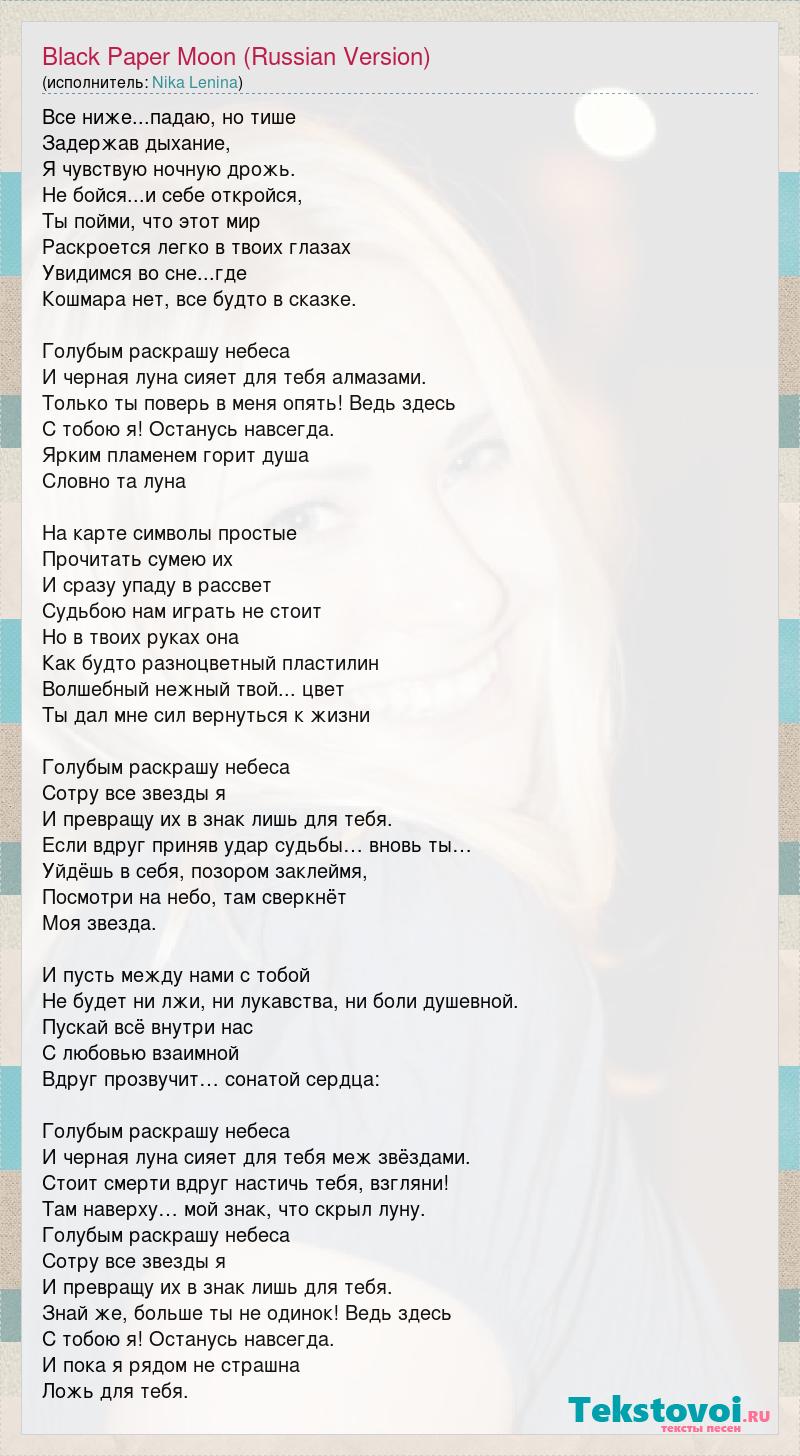 Все ниже...падаю, но тише Задержав дыхание, Я чувствую ночную дрожь. Не бойся...и себе откройся, Ты пойми, что этот мир Раскроется легко в твоих глазах Увидимся во сне...где Кошмара нет, все будто в сказке. Голубым раскрашу небеса И черная луна сияет для тебя алмазами. Только ты поверь в меня опять! Ведь здесь С тобою я! Останусь навсегда. Ярким пламенем горит душа Словно та луна На карте символы простые Прочитать сумею их И сразу упаду в рассвет Судьбою нам играть не стоит Но в твоих руках она Как будто разноцветный пластилин Волшебный нежный твой... цвет Ты дал мне сил вернуться к жизни Голубым раскрашу небеса Сотру все звезды я И превращу их в знак лишь для тебя. Если вдруг приняв удар судьбы… вновь ты… Уйдёшь в себя, позором заклеймя, Посмотри на небо, там сверкнёт Моя звезда. И пусть между нами с тобой Не будет ни лжи, ни лукавства, ни боли душевной. Пускай всё внутри нас С любовью взаимной Вдруг прозвучит… сонатой сердца: Голубым раскрашу небеса И черная луна сияет для тебя меж звёздами. Стоит смерти вдруг настичь тебя, взгляни! Там наверху… мой знак, что скрыл луну. Голубым раскрашу небеса Сотру все звезды я И превращу их в знак лишь для тебя. Знай же, больше ты не одинок! Ведь здесь С тобою я! Останусь навсегда. И пока я рядом не страшна Ложь для тебя.