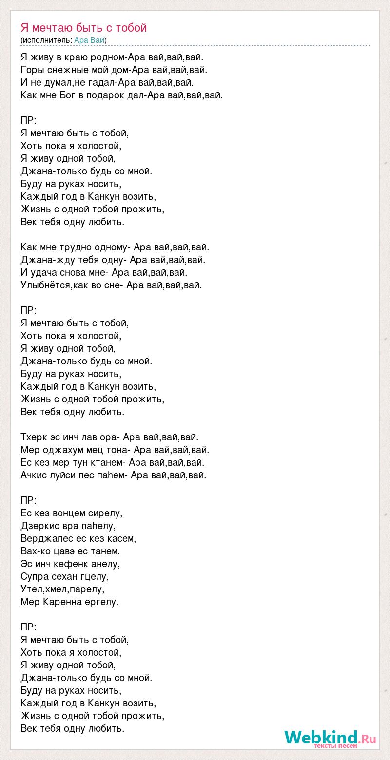 Я живу в краю родном-Ара вай,вай,вай. Горы снежные мой дом-Ара вай,вай,вай. И не думал,не гадал-Ара вай,вай,вай. Как мне Бог в подарок дал-Ара вай,вай,вай. ПР: Я мечтаю быть с тобой, Хоть пока я холостой, Я живу одной тобой, Джана-только будь со мной. Буду на руках носить, Каждый год в Канкун возить, Жизнь с одной тобой прожить, Век тебя одну любить. Как мне трудно одному- Ара вай,вай,вай. Джана-жду тебя одну- Ара вай,вай,вай. И удача снова мне- Ара вай,вай,вай. Улыбнётся,как во сне- Ара вай,вай,вай. ПР: Я мечтаю быть с тобой, Хоть пока я холостой, Я живу одной тобой, Джана-только будь со мной. Буду на руках носить, Каждый год в Канкун возить, Жизнь с одной тобой прожить, Век тебя одну любить. Тхерк эс инч лав ора- Ара вай,вай,вай. Мер оджахум мец тона- Ара вай,вай,вай. Ес кез мер тун ктанем- Ара вай,вай,вай. Ачкис луйси пес паhем- Ара вай,вай,вай. ПР: Ес кез вонцем сирелу, Дзеркис вра паhелу, Верджапес ес кез касем, Вах-ко цавэ ес танем. Эс инч кефенк анелу, Супра сехан гцелу, Утел,хмел,парелу, Мер Каренна ергелу. ПР: Я мечтаю быть с тобой, Хоть пока я холостой, Я живу одной тобой, Джана-только будь со мной. Буду на руках носить, Каждый год в Канкун возить, Жизнь с одной тобой прожить, Век тебя одну любить.