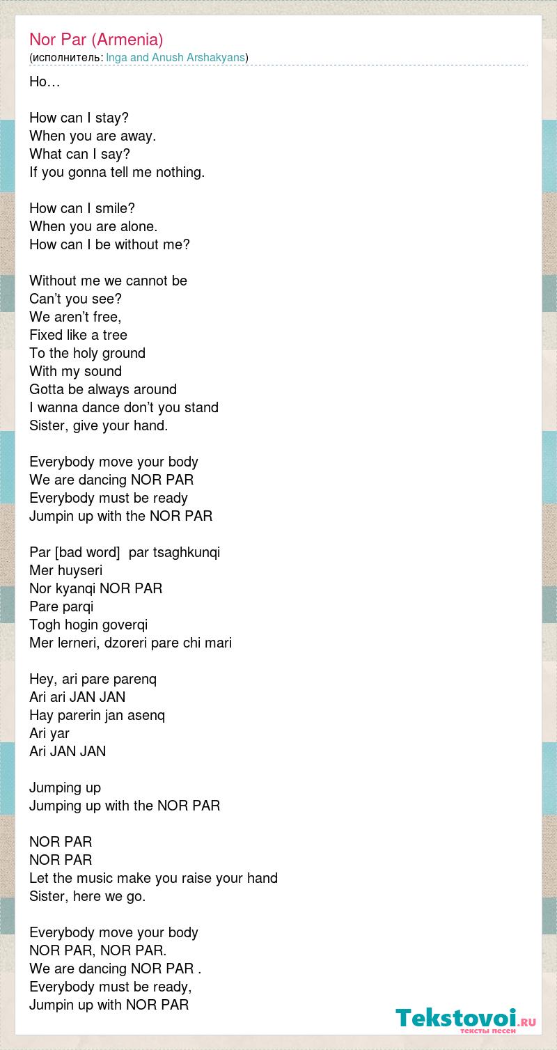 Ho… How can I stay? When you are away. What can I say? If you gonna tell me nothing. How can I smile? When you are alone. How can I be without me? Without me we cannot be Can’t you see? We aren’t free, Fixed like a tree To the holy ground With my sound Gotta be always around I wanna dance don’t you stand Sister, give your hand. Everybody move your body We are dancing NOR PAR Everybody must be ready Jumpin up with the NOR PAR Par [bad word] par tsaghkunqi Mer huyseri Nor kyanqi NOR PAR Pare parqi Togh hogin goverqi Mer lerneri, dzoreri pare chi mari Hey, ari pare parenq Ari ari JAN JAN Hay parerin jan asenq Ari yar Ari JAN JAN Jumping up Jumping up with the NOR PAR NOR PAR NOR PAR Let the music make you raise your hand Sister, here we go. Everybody move your body NOR PAR, NOR PAR. We are dancing NOR PAR . Everybody must be ready, Jumpin up with NOR PAR