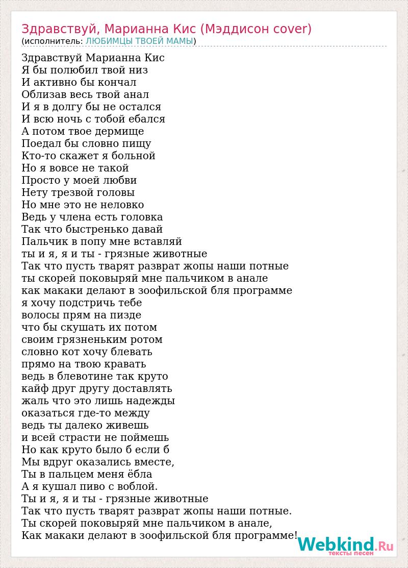 Здравствуй Марианна Кис Я бы полюбил твой низ И активно бы кончал Облизав весь твой анал И я в долгу бы не остался И всю ночь с тобой ебался А потом твое дермище Поедал бы словно пищу Кто-то скажет я больной Но я вовсе не такой Просто у моей любви Нету трезвой головы Но мне это не неловко Ведь у члена есть головка Так что быстренько давай Пальчик в попу мне вставляй ты и я, я и ты - грязные животные Так что пусть тварят разврат жопы наши потные ты скорей поковыряй мне пальчиком в анале как макаки делают в зоофильской бля программе я хочу подстричь тебе волосы прям на пизде что бы скушать их потом своим грязненьким ротом словно кот хочу блевать прямо на твою кравать ведь в блевотине так круто кайф друг другу доставлять жаль что это лишь надежды оказаться где-то между ведь ты далеко живешь и всей страсти не поймешь Но как круто было б если б Мы вдруг оказались вместе, Ты в пальцем меня ёбла А я кушал пиво с воблой. Ты и я, я и ты - грязные животные Так что пусть тварят разврат жопы наши потные. Ты скорей поковыряй мне пальчиком в анале, Как макаки делают в зоофильской бля программе!